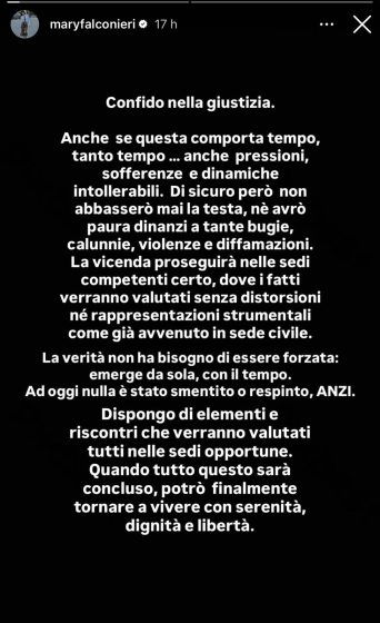 Confido nella giustizia. Anche se questa comporta tempo, tanto tempo … anche pressioni, sofferenze e dinamiche intollerabili. Di sicuro però non abbasserò mai la testa, nè avrò paura dinanzi a tante bugie, calunnie, violenze e diffamazioni. La vicenda proseguirà nelle sedi competenti certo, dove i fatti verranno valutati senza distorsioni né rappresentazioni strumentali come già avvenuto in sede civile. La verità non ha bisogno di essere forzata: emerge da sola, con il tempo. Ad oggi nulla è stato smentito o respinto, ANZI. Dispongo di elementi e riscontri che verranno valutati tutti nelle sedi opportune. Quando tutto questo sarà concluso, potrò finalmente tornare a vivere con serenità, dignità e libertà.