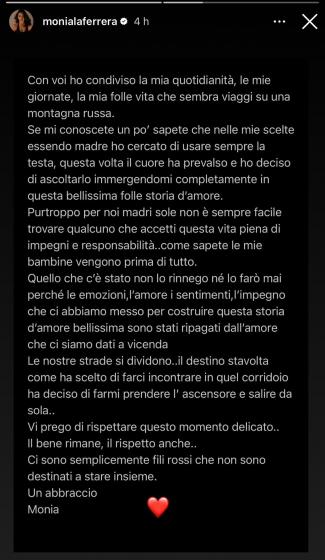 Con voi ho condiviso la mia quotidianità, le mie giornate, la mia folle vita che sembra viaggi su una montagna russa. Se mi conoscete un po’ sapete che nelle mie scelte essendo madre ho cercato di usare sempre la testa, questa volta il cuore ha prevalso e ho deciso di ascoltarlo immergendomi completamente in questa bellissima folle storia d’amore. Purtroppo per noi madri sole non è sempre facile trovare qualcuno che accetti questa vita piena di impegni e responsabilità.. come sapete le mie bambine vengono prima di tutto. Quello che c’è stato non lo rinnego né lo farò mai perché le emozioni, l’amore i sentimenti, l’impegno che ci abbiamo messo per costruire questa storia d’amore bellissima sono stati ripagati dall’amore che ci siamo dati a vicenda. Le nostre strade si dividono.. il destino stavolta come ha scelto di farci incontrare in quel corridoio ha deciso di farmi prendere l’ascensore e salire da sola.. Vi prego di rispettare questo momento delicato.. Il bene rimane, il rispetto anche.. Ci sono semplicemente fili rossi che non sono destinati a stare insieme.