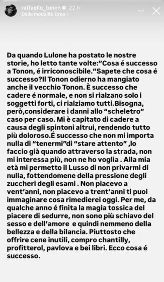 Da quando Lulone ha postato le nostre storie, ho letto tante volte: “Cosa è successo a Tonon, è irriconoscibile.” Sapete che cosa è successo? Il Tonon odierno ha mangiato anche il vecchio Tonon. È successo che cadere è normale, e non si rialzano solo i soggetti forti, ci rialziamo tutti. Bisogna, però, considerare i danni allo “scheletro” caso per caso. Mi è capitato di cadere a causa degli spintoni altrui, rendendo tutto più doloroso. È successo che non mi importa nulla di “tenermi” di “stare attento”, lo faccio già quando attraverso la strada, non mi interessa più, non ne ho voglia. Alla mia età mi permetto il Lusso di non privarmi di nulla, fottendomene della pressione degli zuccheri degli esami. Non piacevo a vent’anni, non piacevo a trent’anni ti puoi immaginare cosa rimedierei oggi. Per me, da qualche anno è finita la magia tossica del piacere di sedurre, non sono più schiavo del sesso e dell’amore e quindi nemmeno della bellezza e della bilancia. Piuttosto che offrire cene inutili, compro chantilly, profiterol, pavlova e bei libri. Ecco cosa è successo.