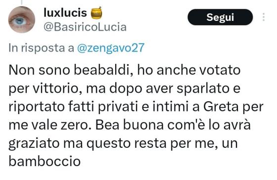 Non sono Beabaldi, ho anche votato per Vittorio, ma dopo aver sparlato e riportato fatti privati e intimi a Greta per me vale zero. Bea buona com’è lo avrà graziato ma questo resta per me, un bamboccio.