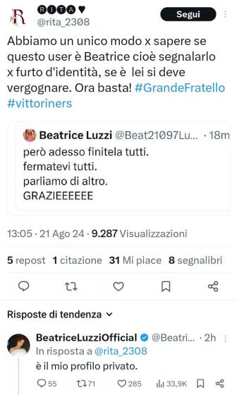 A quel punto altri fan hanno messo in dubbio che il profilo in questione non fosse realmente di Beatrice, ma di qualche account fake. L’attrice romana è intervenuta con il suo profilo twitter ufficiale confermando che quelle risposte provenissero proprio da lei con il suo account privato: