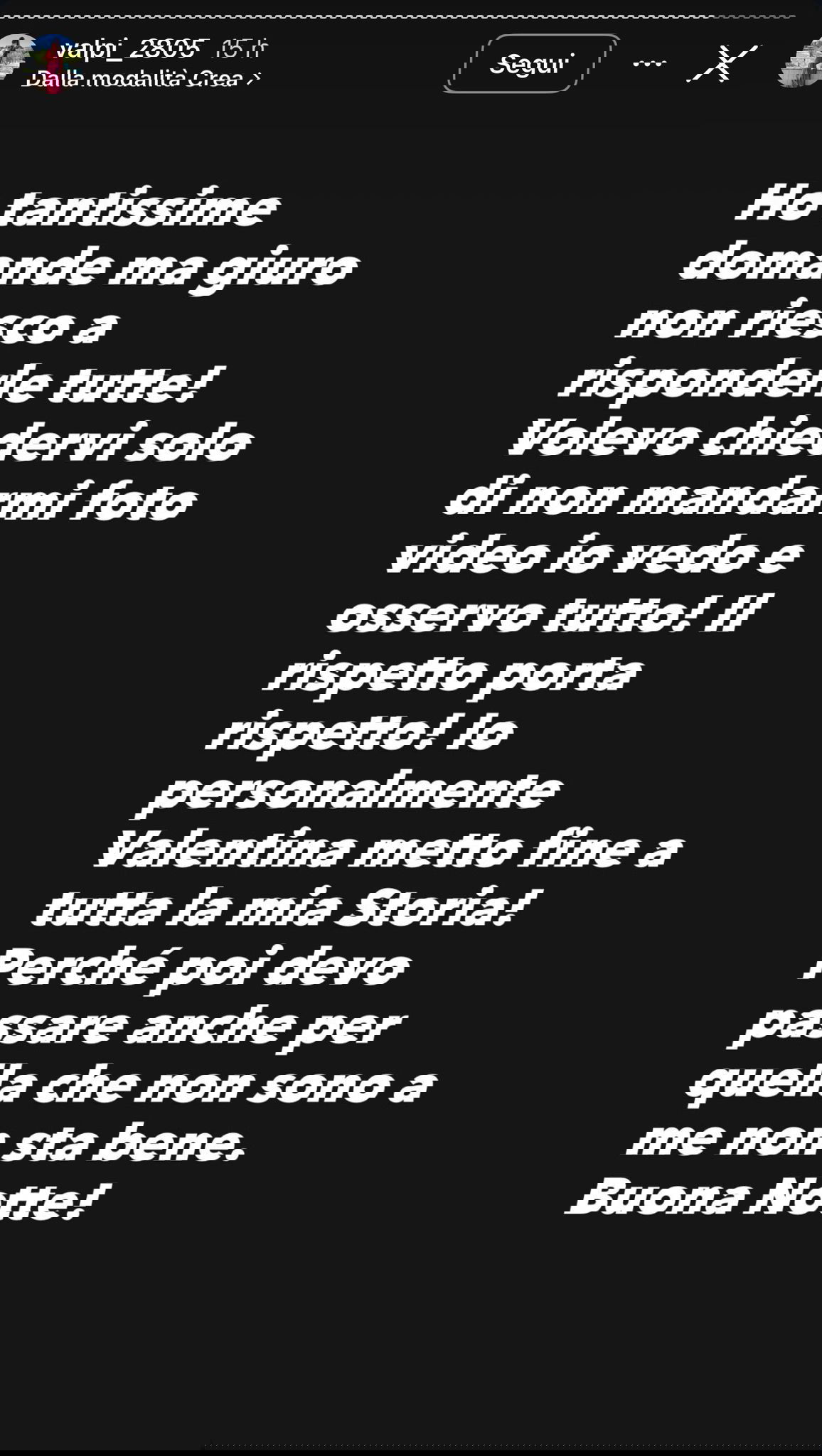 Ho tantissime domande ma giuro non riesco a risponderle tutte! Volevo chiedervi solo di non mandarmi foto, video io vedo e osservo tutto! II rispetto porta rispetto! Io personalmente Valentina metto fine a tutta la mia Storia! Perché poi devo passare anche per quella che non sono a me non sta bene. Buona Notte!