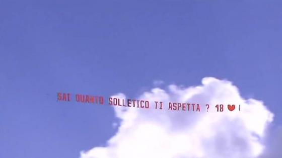“Sai quanto solletico ti aspetta? 18” è questo il messaggio aereo ricevuto dalla giovanissima e fatto recapitare dal suo fidanzato Andrea Damante: