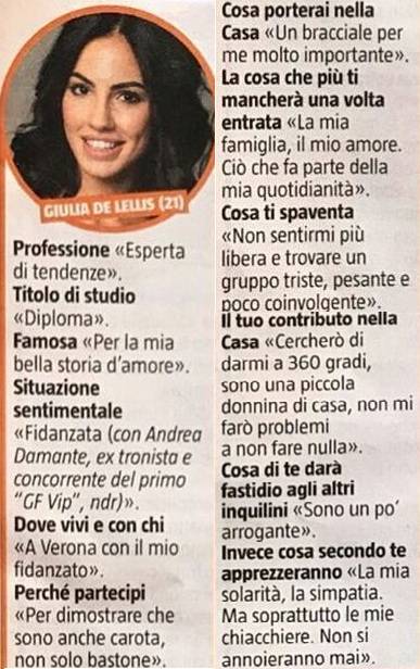 Giulia De Lellis, ex corteggiatrice di Uomini e Donne nonché fidanzata di Andrea Damante, ancor prima di iniziare il programma è sicuramente la concorrente più chiacchierata. Ecco le sue affermazioni: