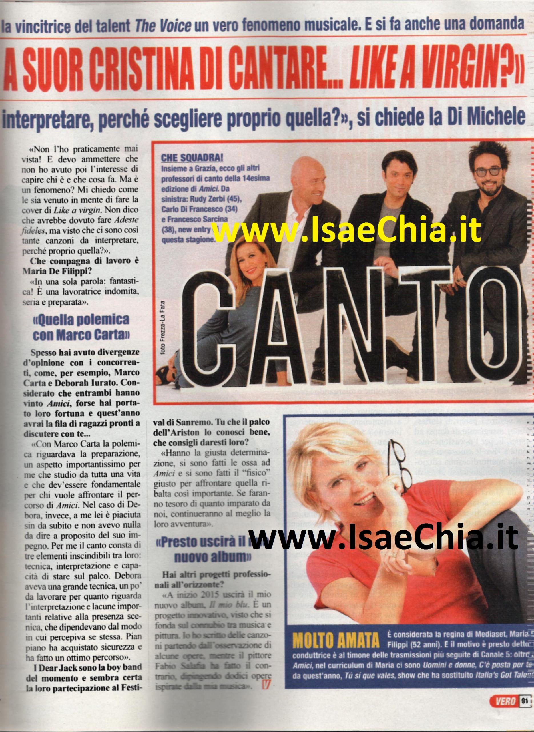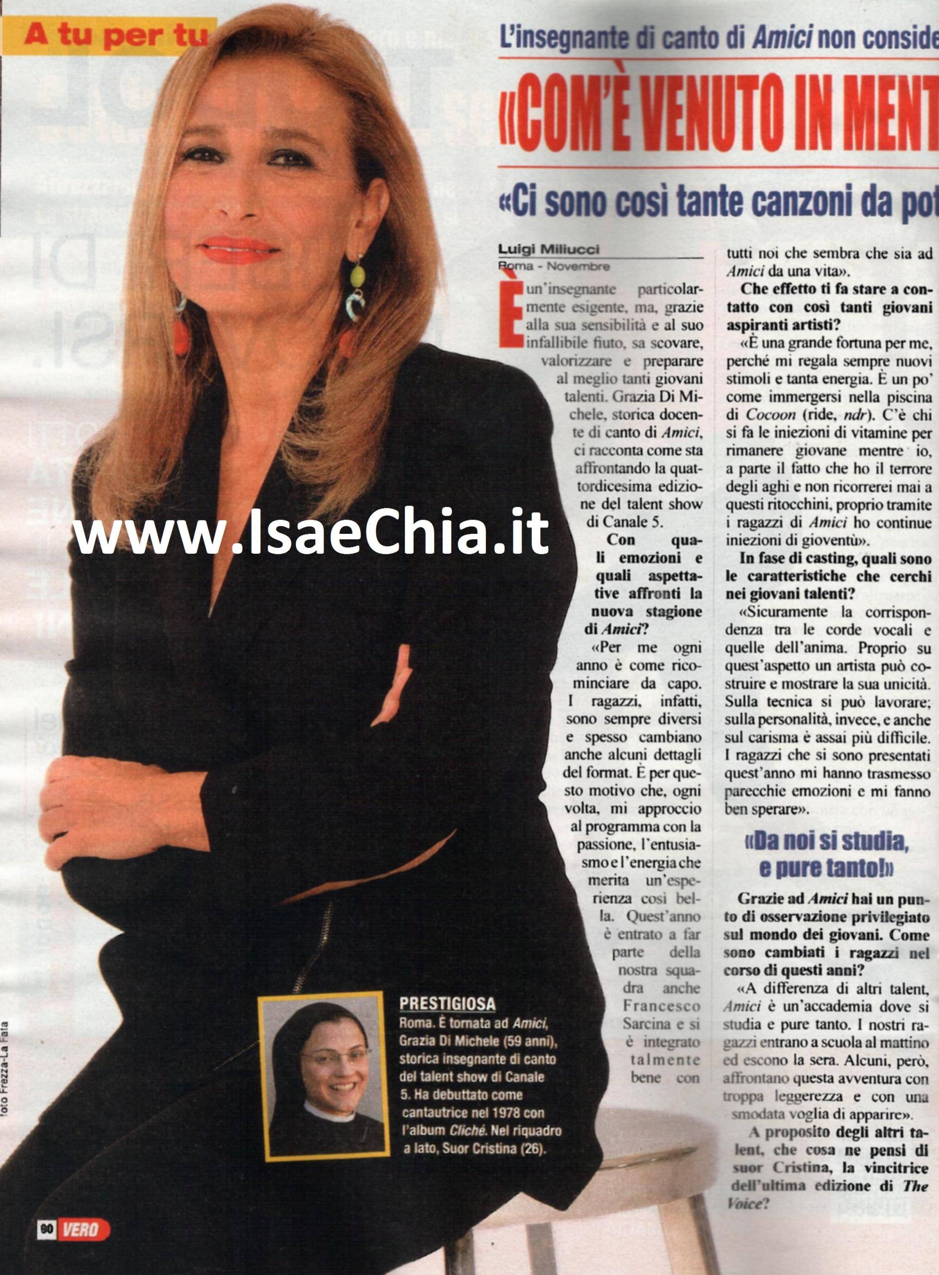 Grazia Di Michele è ancora una volta tra le insegnanti di canto di Amici e racconta come si prepara ad affrontare quest’edizione appena iniziata: “Per me ogni anno è come ricominciare da capo. I ragazzi, infatti, sono sempre diversi e spesso cambiano dei dettagli del format. Quest’anno è entrato a far parte della nostra squadra anche Francesco Sàrcina, che si è integrato talmente bene che sembra stare con noi da una vita. Per me collaborare con giovani artisti è una fortuna, perché mi regala sempre nuovi stimoli e nuova energia. C’è chi ricorre alle iniezioni di vitamine per rimanere giovani; io ho paura degli aghi e sono contraria ai ritocchini, quindi faccio le mie iniezioni di gioventù! Quello che cerco nei casting è la corrispondenza tra le corde vocali e l’anima: sulla tecnica si può lavorare, sulla personalità e sul carisma no. I ragazzi di quest’anno mi hanno trasmesso tanto e mi fanno ben sperare”. Quando le si chiede di commentare Suor Cristina Scuccia, protagonista indiscussa del talent “concorrente” di Amici, The Voice of Italy, la cantautrice risponde: “Non l’ho praticamente mai vista! E devo ammettere che non ho avuto interesse a capire chi è e cosa fa. Ma è un fenomeno? Mi chiedo come le sia venuto in mente di fare una cover di Like a virgin? Non dico che avrebbe dovuto cantare Adeste fideles, ma ci sono tante canzoni da interpretare…Perché proprio quella?”. Quando invece le si chiede delle sue divergenze con alcuni concorrenti del talent, come Marco Carta e Deborah Iurato, risponde: “Con Carta la polemica riguardava la preparazione, argomento per me importantissimo per chi vuole affrontare il percorso di Amici. Deborah mi è sempre piaciuta e non ho niente da dire sul suo impegno. Per me il canto consta di tre cose: tecnica, preparazione e capacità di stare sul palco; le sue lacune nella presenza scenica dipendevano dal modo di percepire sé stessa. Pian piano ha acquisito sicurezza e ha fatto un bel percorso. I Dear Jack hanno la giusta determinazione e se faranno tesoro di quanto imparato ad Amici, continueranno al meglio la loro avventura”. Infine, Grazia rivela i suoi progetti paralleli: “Nel 2015 uscirà il mio album Il mio blu. È un progetto innovativo, si basa sul connubio tra musica e pittura: ho scritto delle canzoni partendo dall’osservazione di alcune opere, mentre il pittore Fabio Salafia ha dipinto delle opere partendo dalle mie canzoni”.