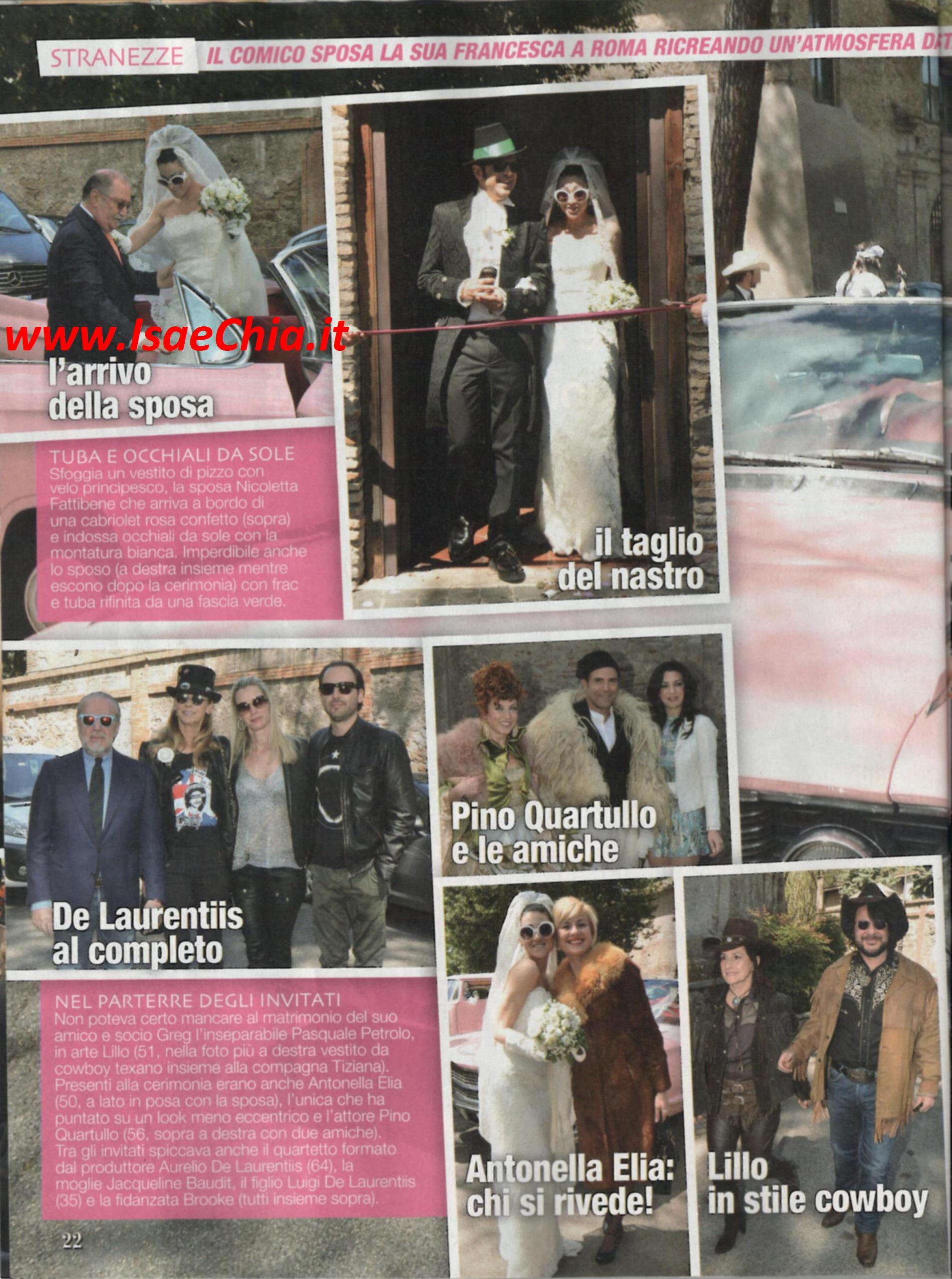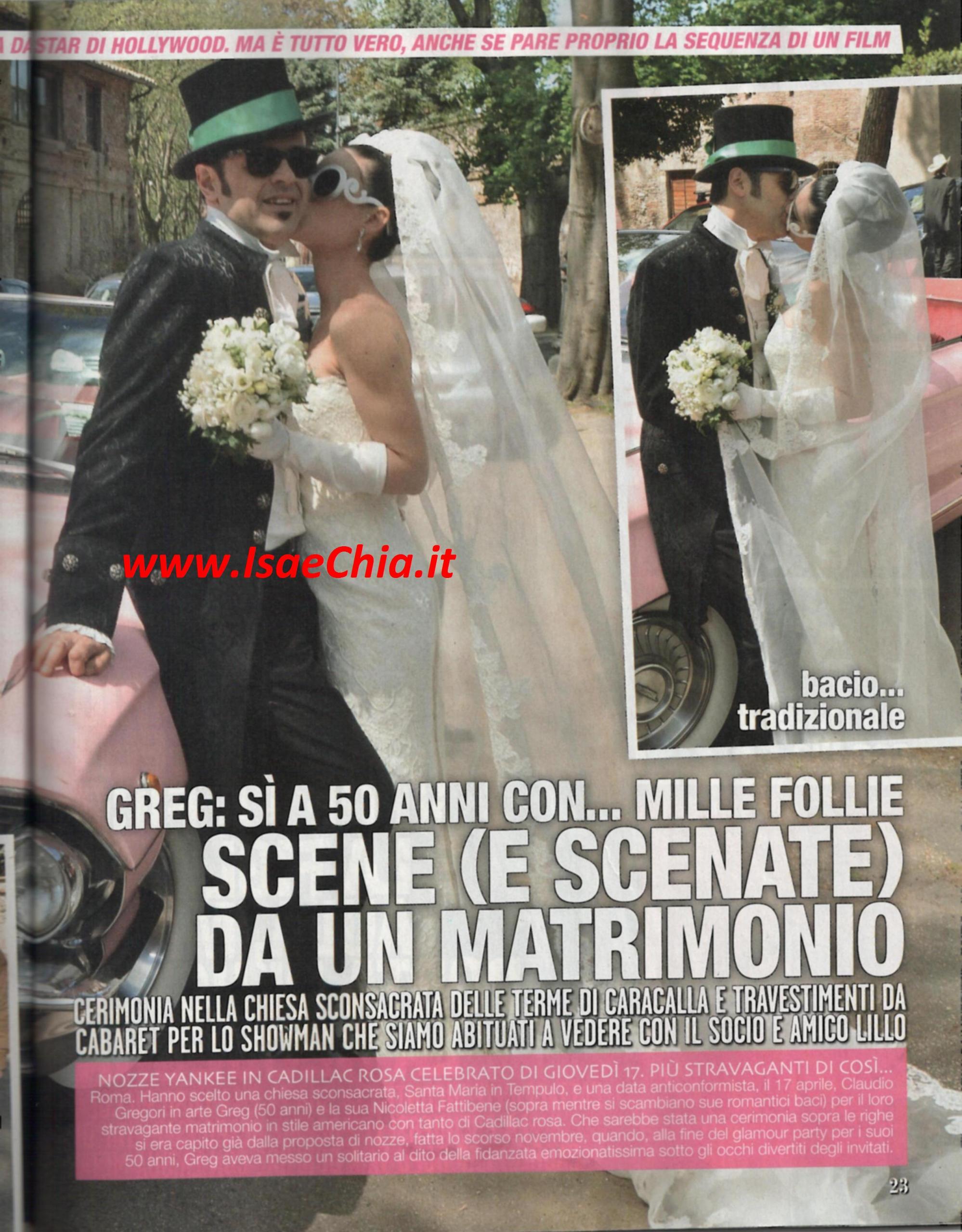 Claudio Gregori, in arte Greg del duo Lillo e Greg, all’età di 50 anni è finalmente convolato a nozze con la sua Nicoletta Fattibene. I due hanno scelto una chiesa sconsacrata di Roma e una data anticonformista, il 17 aprile. Ma l’intero matrimonio è stato sopra le righe e lo si era capito già dalla proposta, arrivata lo scorso novembre, alla festa per i 50 anni di lui, quando il comico aveva messo l’anello al dito alla fidanzata davanti agli occhi divertiti degli invitati. Le nozze sono state in stile rigorosamente americano: la sposa è arrivata su una cabriolet Cadillac rosa confetto, con occhiali da sole dalla vistosa montatura bianca. Lo sposo, invece, indossa il frac e una tuba rifinita con un nastro verde. Il collega Lillo (vero nome Pasquale Petrolo) si è presentato vestito da cowboy con la compagna Tiziana. Presenti alla cerimonia anche la vincitrice dell’ultima edizione dell’Isola dei famosi Antonella Elia, con un’eccentrica pelliccia, e il produttore Aurelio De Laurentiis con la famiglia.