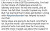 Volevo prendere un momento per onorare e riconoscere #PrideMonth. Per me, #Pride rappresenta difendere te stesso e coloro che ti circondano, abbracciando l’amore per te stesso e indossando le tue strisce con orgoglio. Voglio ringraziare l’incredibile comunità di individui e alleati #LGBTQ per essere quello che sei e fare quello che fai. Come molti nella comunità LGBTQ, ho avuto la mia giusta dose di sfide intorno alla mia identità e al modo in cui mi inserisco nel mondo e a volte ho sentito di non poter dire la mia verità. Ma ho imparato che migliora. Vivere con #bipolardisorder mi ha aiutato a insegnarmelo. Alcuni giorni saranno difficili. E va bene. Ma più riesco a ricordare a me stesso che sono orgoglioso di chi sono e quanto lontano sono arrivato, e più parlo del supporto di cui ho bisogno e di tutte le cose che mi fanno, che sia con la mia famiglia, amici o tutti voi – i giorni più belli che ho. Quindi amici: state tranquilli, state bene ed essere orgogliosi.