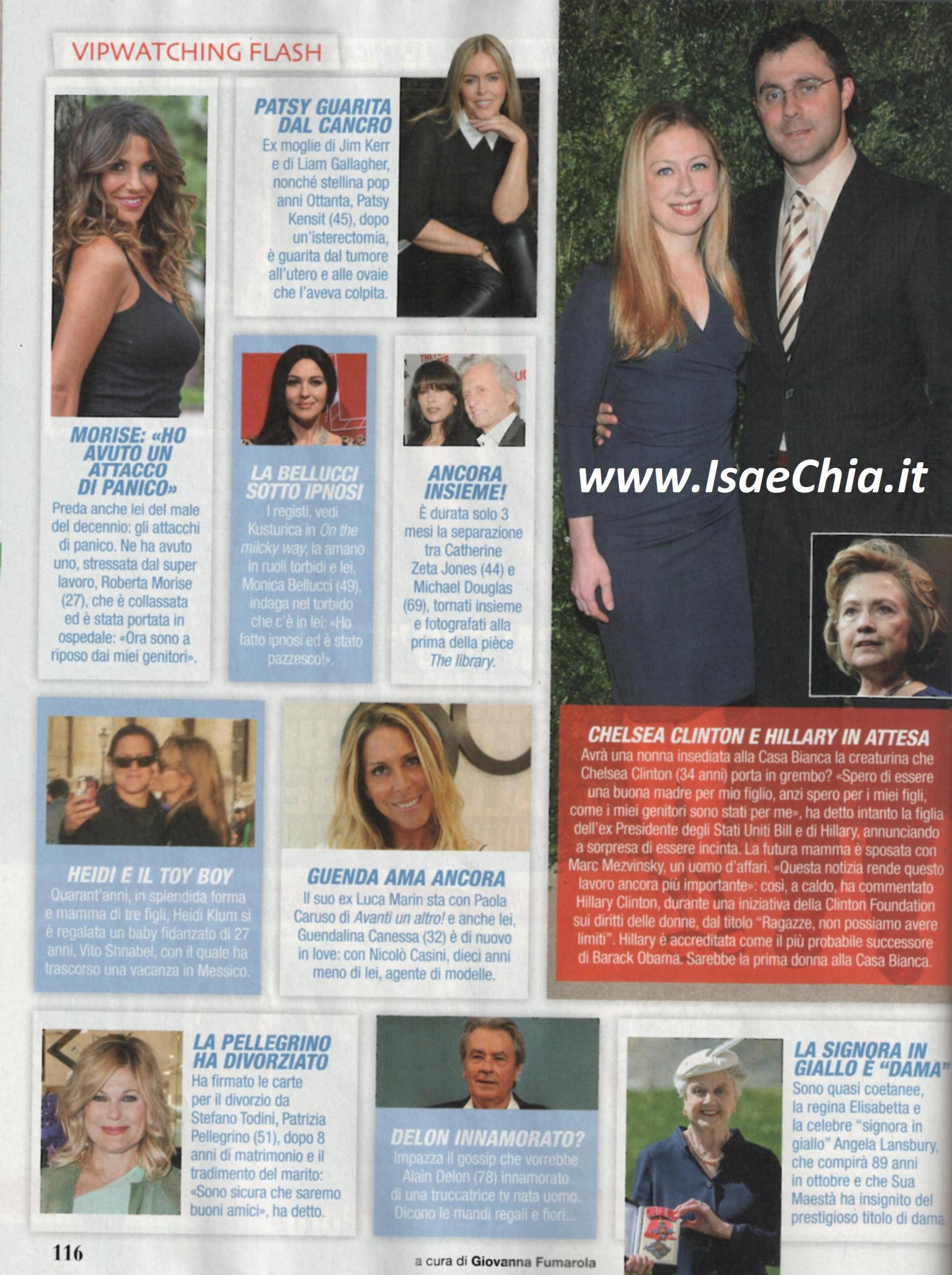 Ha firmato le carte per il divorzio l’attrice ed ex naufraga Patrizia Pellegrino, dopo il tradimento del marito Stefano Todini: “Sono sicura che saremo buoni amici” ha dichiarato lei tuttavia. Tra Catherine Zeta Jones e Micheal Douglas, invece, è durata solo tre mesi la separazione: i due divi di Hollywood sono stati rivisti insieme alla prima della pièce The library. Infine, annuncia di essere incinta Chelsea Clinton, figlia dell’ex presidente USA Bill Clinton e moglie dell’uomo d’affari Marc Mezvinsky. “Questa notizia rende il mio lavoro ancora più importante” ha commentato invece la futura nonna Hillary.