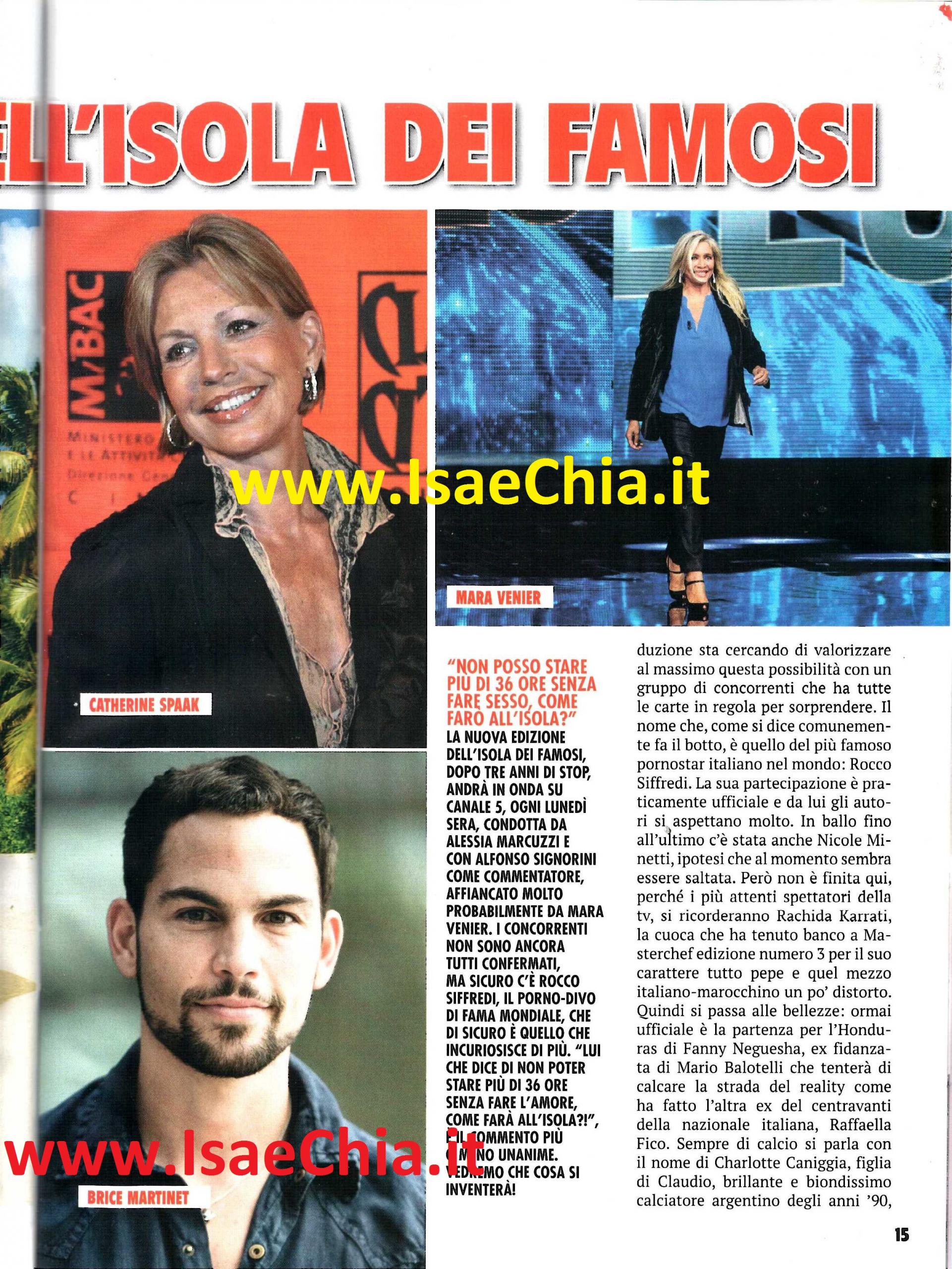 Tra poco più di due settimane, con precisione il 26 gennaio, andrà in onda su Canale 5 la nuova stagione de L’Isola dei Famosi. Come supposto fin dall’inizio, la conduttrice sarà Alessia Marcuzzi, finora al timone del Grande fratello. Al suo fianco, nelle vesti di opinionista, ancora una volta Alfonso Signorini, che aveva rivestito questo ruolo già al GF. Inoltre, in studio dirà la sua anche Mara Venier, reduce dal successo come giudice a Tu sì que vales. Quanto ai concorrenti, ci sono già alcuni nomi ufficiali, confermati anche dal settimanale Chi: il pornoattore Rocco Siffredi, l’attrice e conduttrice Catherine Spaak, il modello e attore Brice Martinet, Fanny Neguesha (ex del calciatore Mario Balotelli), Charlotte Caniggia (prorompente figlia del calciatore Claudio), la concorrente di MasterChef Rachida Karrati (QUI per rileggere l’articolo tratto da Chi). Gli altri concorrenti dovrebbero essere Cecilia Rodriguez (sorella di Belén e fidanzata dell’ex tronista Francesco Monte), l’ex concorrente di Amici Valerio Scanu, le ex concorrenti di X Factor Le Donatella, il conduttore radiofonico Pierluigi Diaco. Negli ultimi giorni, sono venuti fuori altri nomi, come gli attori Alex Belli e Andrea Montovoli, e Melissa P, autrice di romanzi erotici.