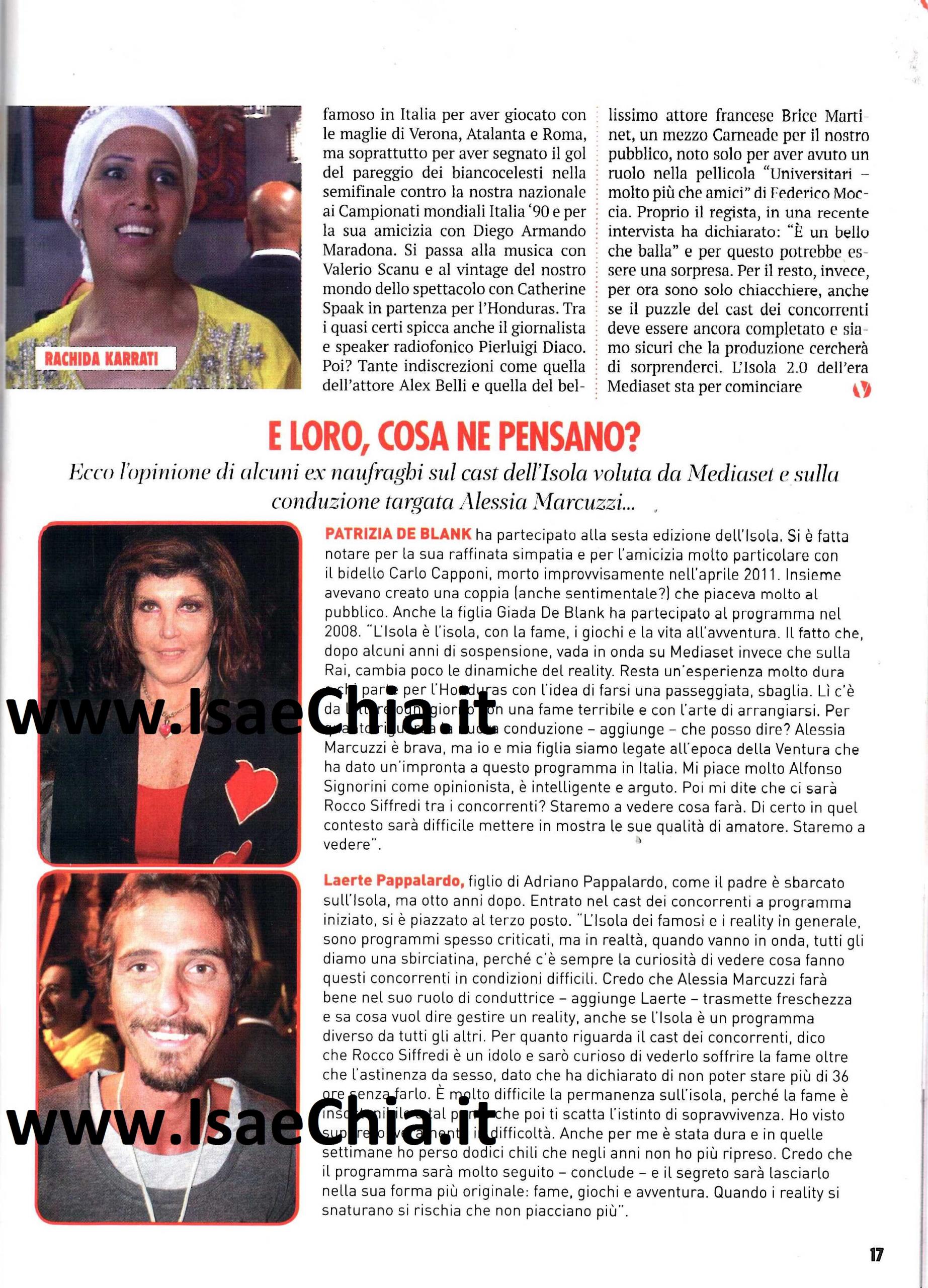 Nell’attesa di scoprire chi sarà sull’Isola, abbiamo chiesto ad alcuni ex concorrenti che cosa pensano delle novità di quest’edizione targata Mediaset. La contessa Patrizia De Blanck commenta: “Il fatto che vada su Mediaset anziché su Rai cambia poco le dinamiche del gioco. Alessia Marcuzzi è brava, ma io e mia figlia Giada, anche lei concorrente, siamo legate all’epoca di Simona Ventura, che ha dato un’impronta al programma. Mi piace molto Signorini come opinionista: è arguto e intelligente. Siffredi come concorrente? In quel contesto sarà difficile mettere in mostra le sue qualità di amatore, ma staremo a vedere!“. Più o meno d’accordo è Laerte Pappalardo, figlio del cantante Adriano, e come lui concorrente dell’Isola: “Credo che Alessia farà bene nel suo ruolo di conduttrice: trasmette freschezza e sa cosa vuol dire gestire un reality, anche se l’Isola è diversa da tutti. Sarò curioso di vedere Rocco soffrire la fame, oltre che l’astinenza da sesso. Per me fu molto dura: in quei giorni persi 12 chili, che col tempo non ho più ripreso. Credo che il programma sarà molto seguito e il segreto è lasciarlo nella sua forma originale: fame, giochi e avventura“.