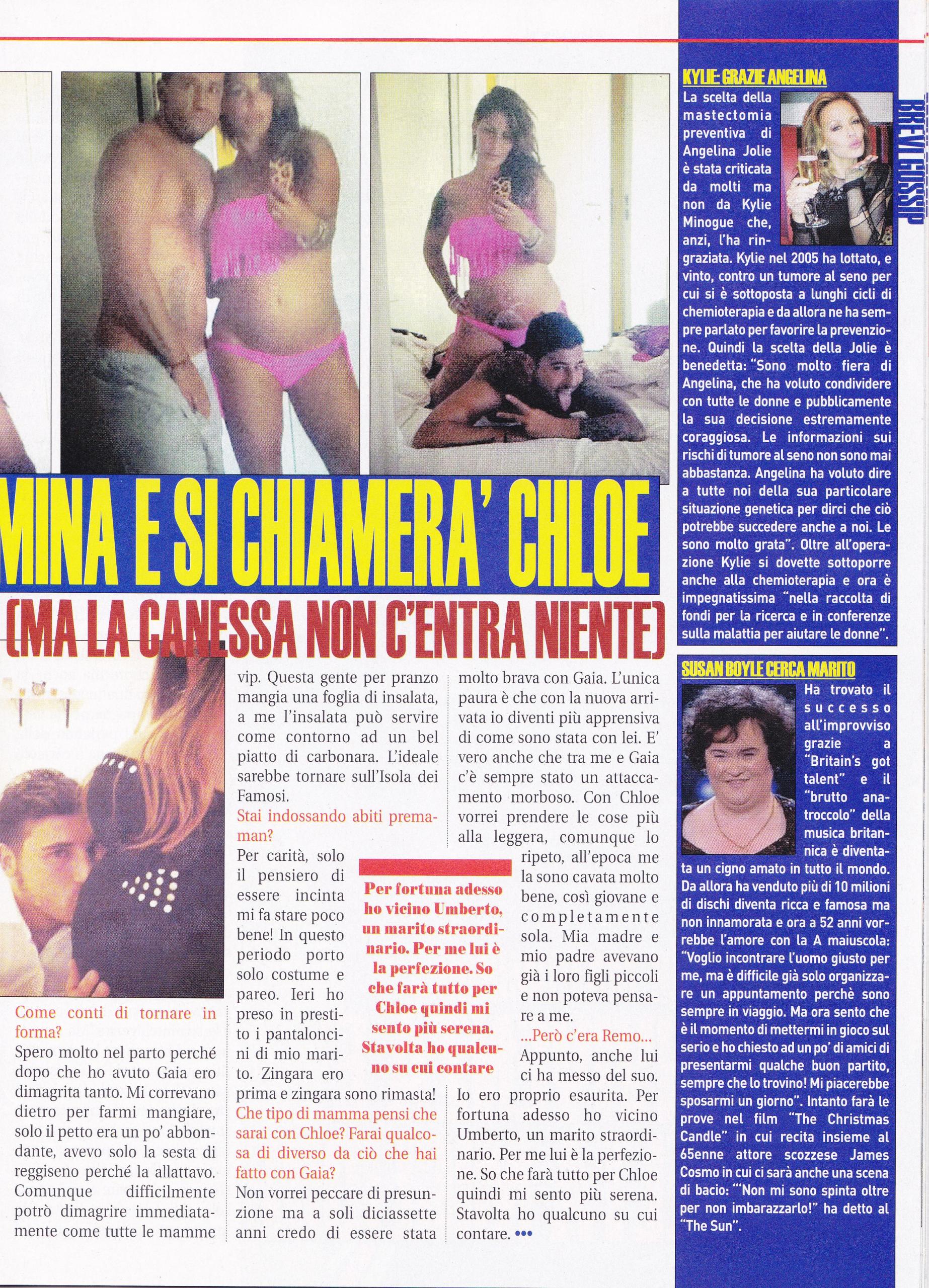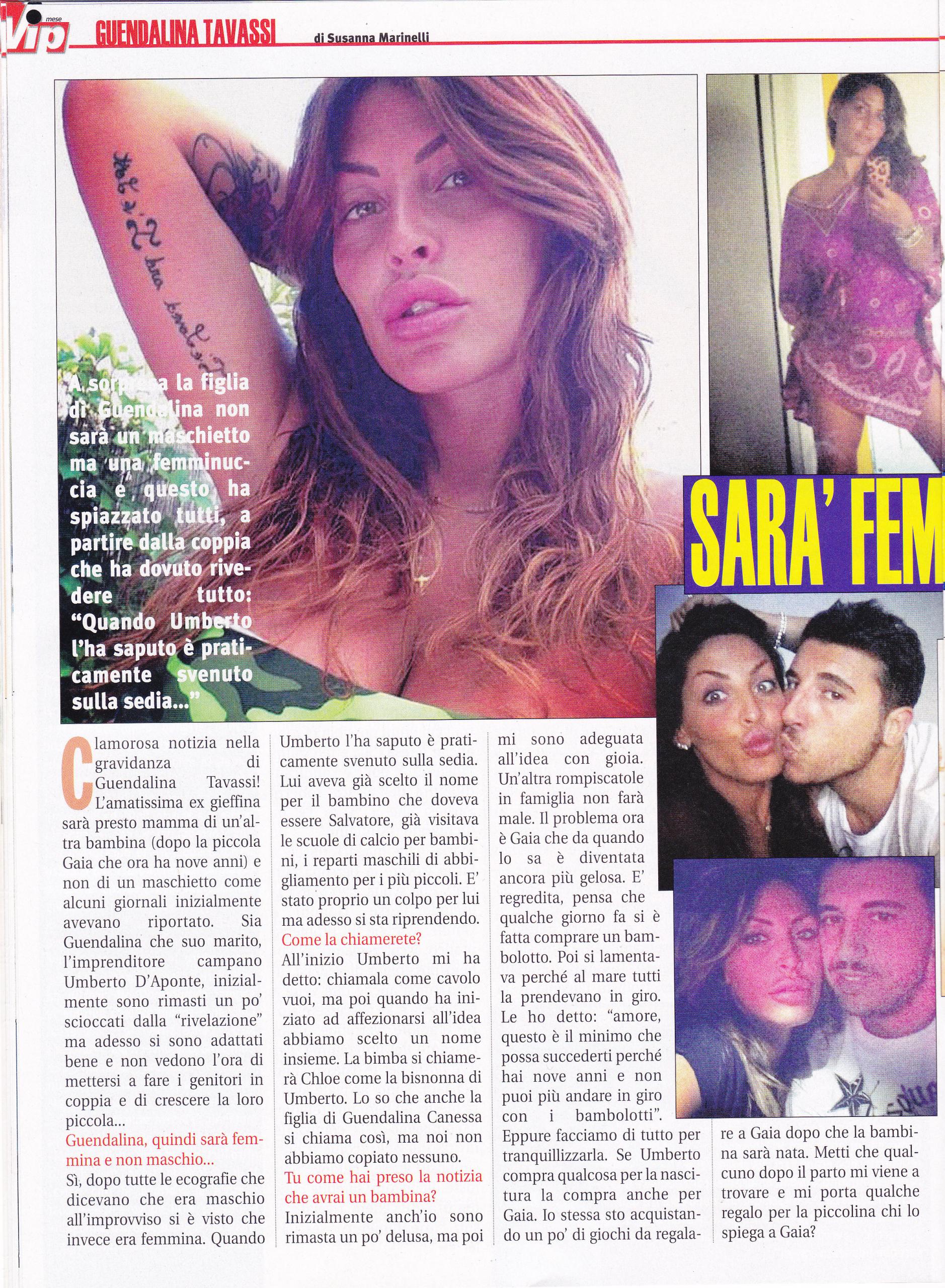 La concorrente del Grande fratello Guendalina Tavassi rivela il simpatico aneddoto della sua gravidanza: “Dopo tante ecografie in cui ci dicevano che sarebbe stato un maschietto, è saltato fuori che è una femminuccia! Quando mio marito Umberto D’Aponte l’ha saputo è saltato dalla sedia. Avevamo già scelto il nome, Salvatore, e lui già visitava le scuole calcio! La chiameremo Chloe, come la bisnonna di lui. Lo so che anche la figlia di Guendalina Canessa si chiama così, ma noi non abbiamo copiato nessuno! Anch’io ero un po’ delusa dalla notizia di avere un’altra bambina, ma mi sono adeguata con gioia. Il problema è mia figlia Gaia, che è diventata gelosa. Eppure facciamo di tutto per tranquillizzarla: se Umberto compra qualcosa per la nascitura, compra qualcosa anche per lei. Spero di tornare in forma dopo il parto, come per la prima gravidanza. Io non sono come le altre vip, che mangiano un’insalata a pranzo! L’ideale sarebbe tornare sull’Isola dei famosi! Non vorrei essere presuntuosa, ma credo di esser stata una buona mamma per Gaia, nonostante avessi 17 anni. Spero di non essere troppo apprensiva: con Chloe vorrei prendere le cose più alla leggera. Con Gaia c’era Remo Nicolini, che ci ha messo del suo ed ero proprio esaurita. Umberto, invece, è un marito straordinario e so che ho qualcuno su cui contare”.