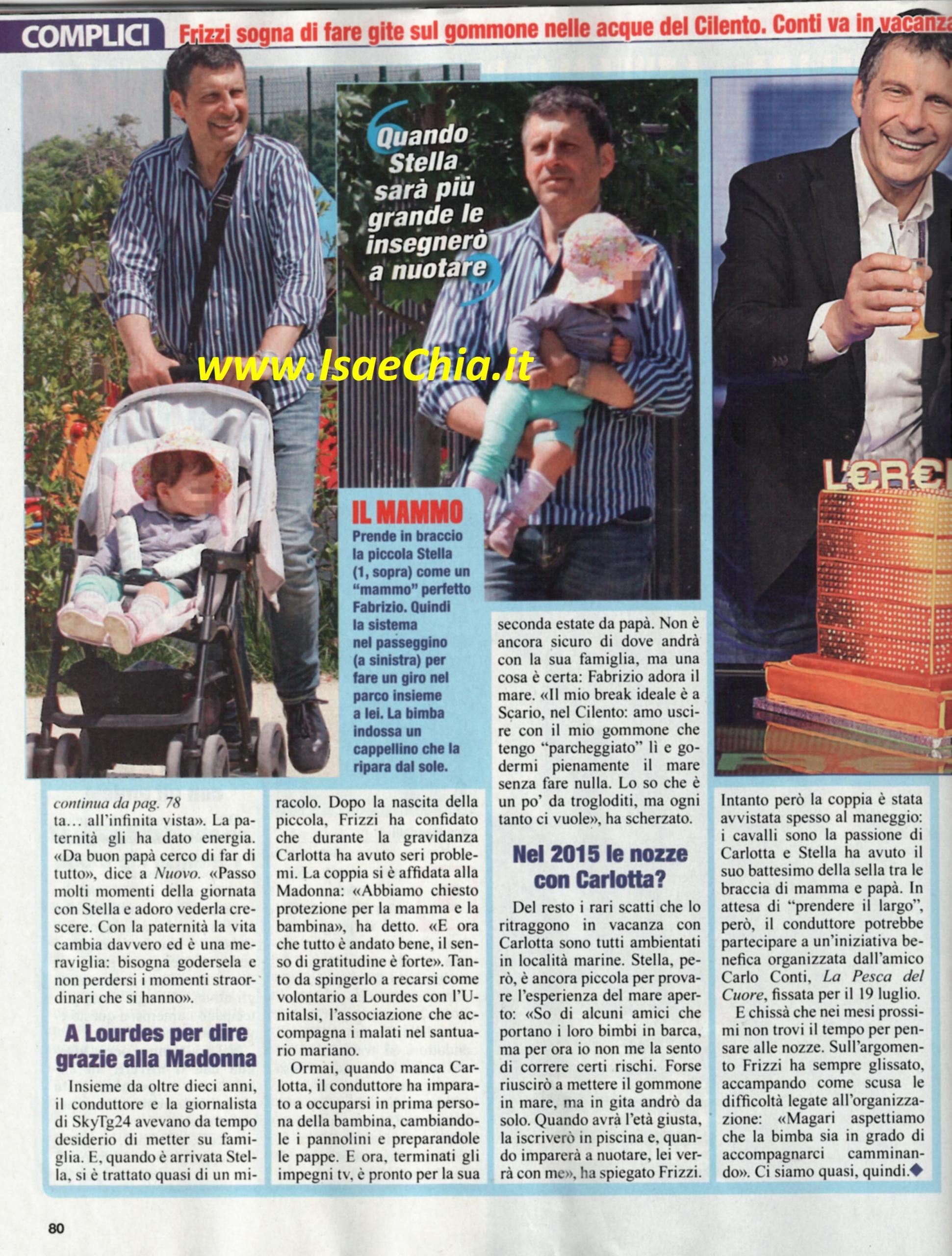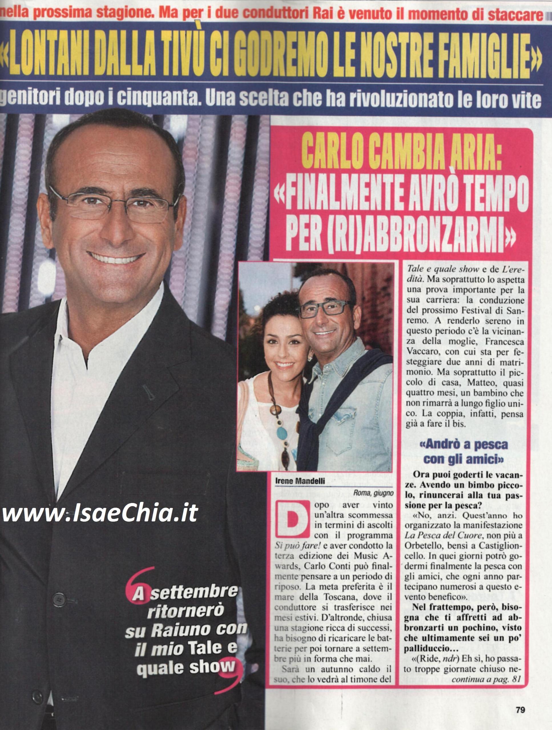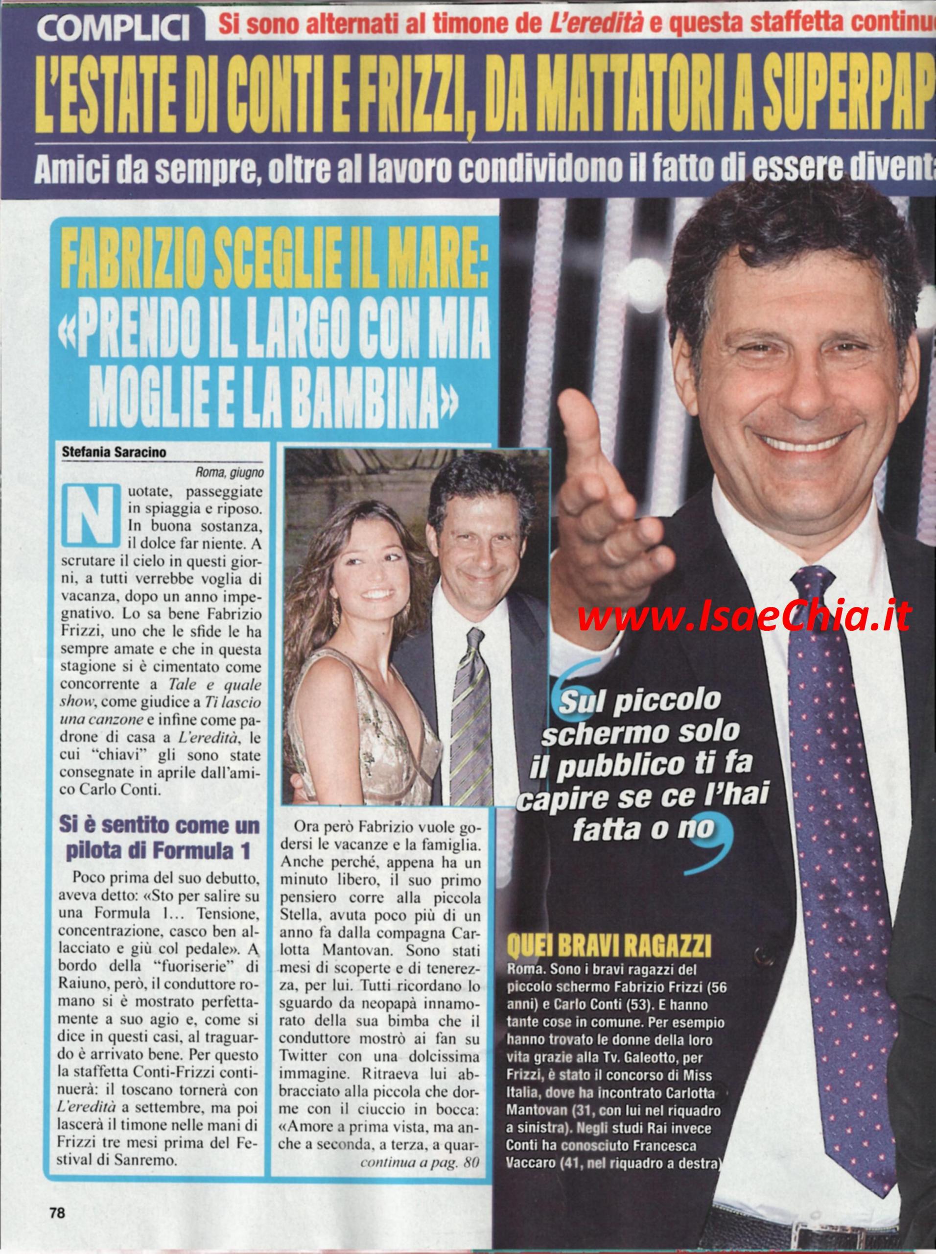 I due conduttori della Rai Fabrizio Frizzi e Carlo Conti hanno tante cose in comune: la loro “staffetta” con il quiz L’eredità continuerà anche nella prossima stagione, in cui Conti tornerà ad inizio stagione, per poi lasciare posto a Frizzi. Ma non solo: i due sono entrambi diventati papà da poco e hanno trovato l’amore grazie al loro lavoro in tv. Frizzi è reduce dal successo del Tale e quale show, al quale ha partecipato, però, come concorrente, mentre Conti ha presentato il suo nuovo programma Si può fare. E, mentre si prepara già a condurre il prossimo Festival di Sanremo, si gode un po’ di vacanza: “Non rinuncerò alla pesca, anzi ho organizzato l’evento Pesca nel Cuore, a Castiglioncello. Non ho avuto tempo per pensare alla mia abbronzatura, ma adesso mi trasferisco al mare con mia moglie, Francesca Vaccaro, e mio figlio, così posso riposarmi e godermi mio figlio”. Quando gli si chiede se condurre per tre volte i Wind Awards è un riscaldamento per Sanremo, risponde: “No, sono due cose diverse: i Wind Awards sono una grande festa della musica, che mi riportano a quando ero deejay. Ora stiamo nella fase più importante del Festiva: stiamo preparando i regolamenti, ci stiamo preoccupando del “sapore” che vogliamo dare al programma. Non è facile mantenere l’attenzione del pubblico per cinque serate. Io avrei voluto farlo in mezz’ora, ma mi hanno detto che non è possibile” scherza lui. A settembre tornerò con L’Eredità, ma mi sono concesso tre mesi estivi liberi da impegni televisivi prima del Festival: in questo modo posso dedicarmi solo a questo grande evento” specifica lui. E lo stesso fa pure Frizzi, che non vede l’ora di fare il papà full-time: “Il mio break ideale è nel Cilento: amo uscire nel gommone che tengo lì parcheggiato. So di alcuni amici che portano i bimbi in barca, ma per ora non me la sento di correre questo rischio con la mia Stella. Quando avrà l’età giusta, la porterò in piscina e le insegnerò a nuotare” dice lui. E chissà che in quest’estate non trovi il tempo per chiedere a Carlotta di sposarlo…”Magari aspettiamo che la bimba sia in grado di accompagnarci camminando” aveva detto lui.