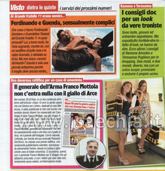 Il meglio deve ancora venire? Angelica Livraghi ha già dichiarato guerra a Guendalina Tavassi, colpevole di aver rilasciato dichiarazioni particolari sul suo fidanzato Ferdinando Giordano. Non perdetevi quindi il prossimo numero di Visto, specie se volete imparare a diventare daltoniche come Teresanna Pugliese e Ramona Amodeo 🙂