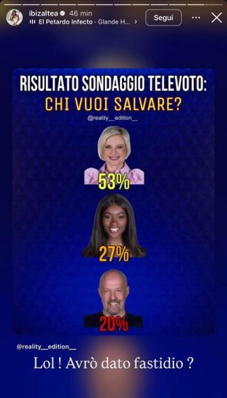 Subito dopo, ha voluto pubblicare un sondaggio scelto dal web in cui l’ha vista salva dal televoto a discapito di Marco Berry. La modella, non ha esitato a mandare una velata frecciatina: