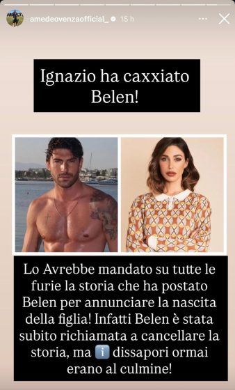 Nelle ultime ore però Amedeo Venza ha postato una storia in cui spiega che la tensione fra Ignazio e Belen sia nuovamente al culmine, il motivo del contendere sarebbe l’annuncio che Belen ha fatto sui social (subito cancellato), quando è nata la nipotina, questo prima ancora che i genitori stessi rendessero nota la nascita: