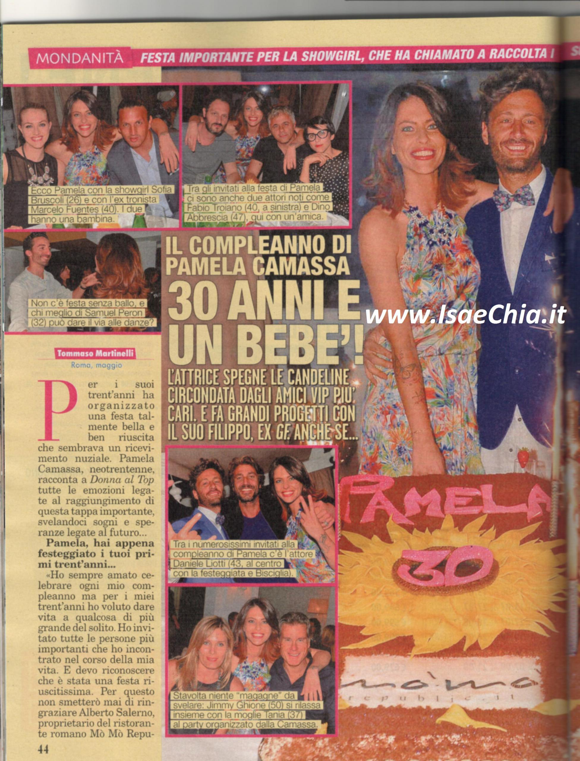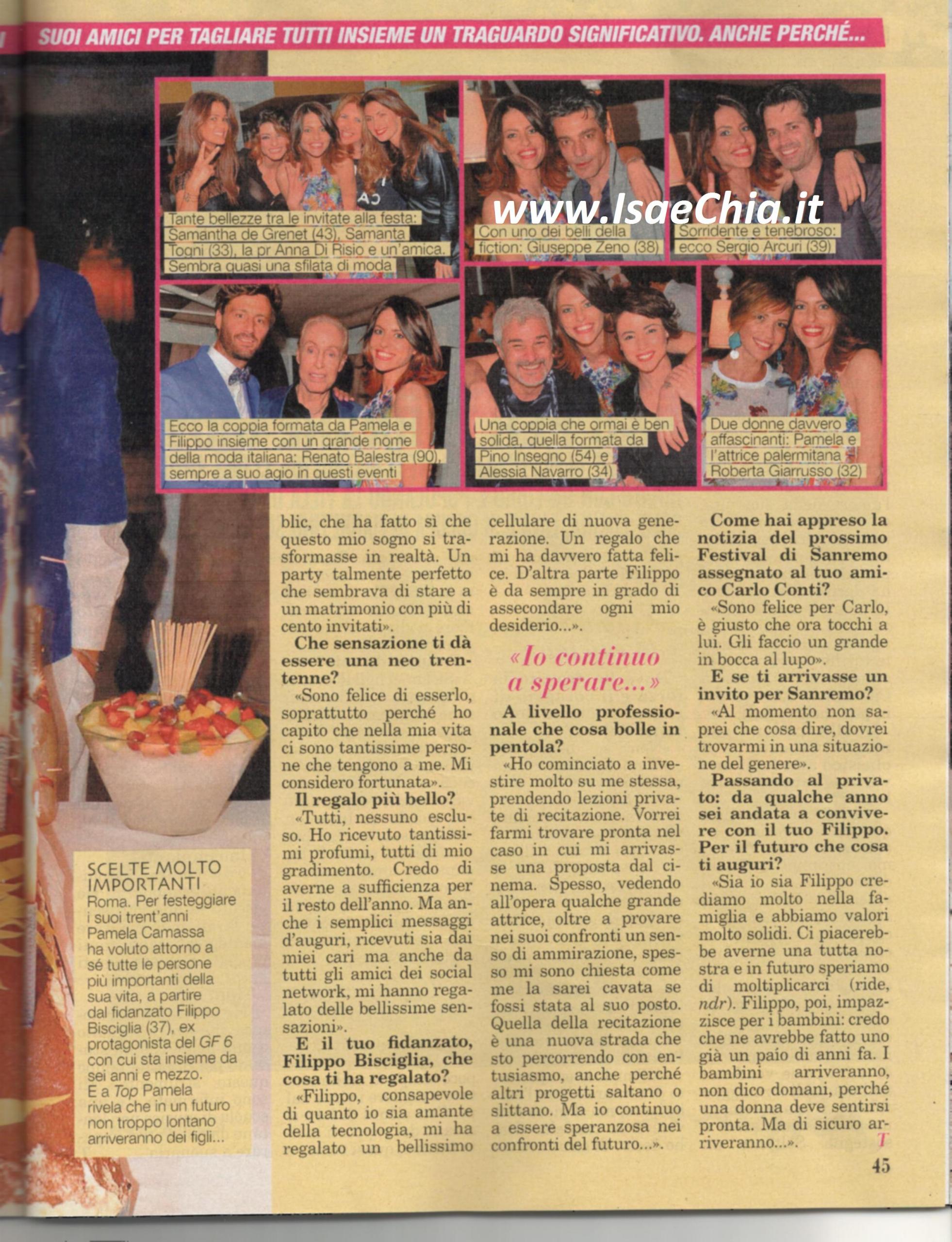 La showgirl Pamela Camassa ha compiuto trent’anni e ha organizzato una festa che sembrava una cerimonia nuziale: “Ho sempre amato festeggiare il compleanno e per questa tappa importante ho voluto dare vita a qualcosa di più grande del solito: ho invitato tutte le persone più importanti che ho incontrato nel corso della vita, arrivando a più di cento invitati, come un matrimonio. Ho capito che ci sono tante persone che tengono a me e mi considero fortunata. Ho ricevuto tutti regali bellissimi, tra cui molti profumi: ne ho abbastanza per tutto l’anno!” e quando le si chiede cosa le abbia regalato il suo fidanzato, il gieffino Filippo Bisciglia, risponde: “Lui, consapevole di quanto sia amante della tecnologia, mi ha regalato un bellissimo cellulare di nuova generazione”. I due sono andati a convivere e Pamela racconta: “Crediamo molto nella famiglia e abbiamo valori molto solidi. Ci piacerebbe averne una tutta nostra e speriamo di moltiplicarci! Filippo impazzisce per i bambini e ne avrebbe fatto uno già un paio d’anni fa. I bambini arriveranno, non dico subito, perché una donna deve sentirsi pronta, ma arriveranno! Ho cominciato a credere molto in me stessa e sto prendendo lezioni di recitazione: continuo ad essere speranzosa nei confronti del futuro!”