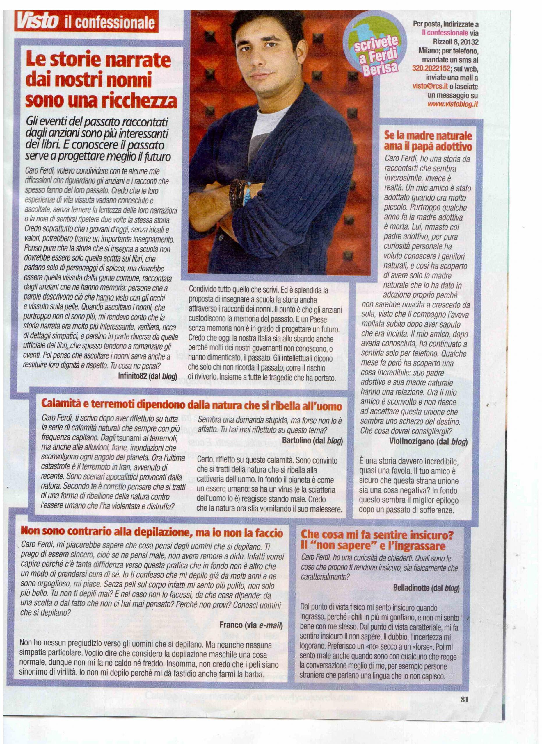 Il vincitore del Grande fratello 9 Ferdi Berisa risponde alle lettere dei suoi lettori. Uno di loro fa una riflessione sull’importanza dei racconti degli anziani, di quanto siano realistici e possano essere d’insegnamento e lui risponde: “La proposta di insegnare la storia a scuola attraverso i racconti dei nonni è splendida. Gli anziani custodiscono la storia di un Paese, che senza memoria del passato non è in grado di costruire un futuro”. Un altro lettore, invece, gli scrive una storia che ha dell’inverosimile. Dopo aver saputo che era stato adottato, ha cercato la sua madre naturale. Poi, quando sua madre adottiva è morta, il padre adottivo ha