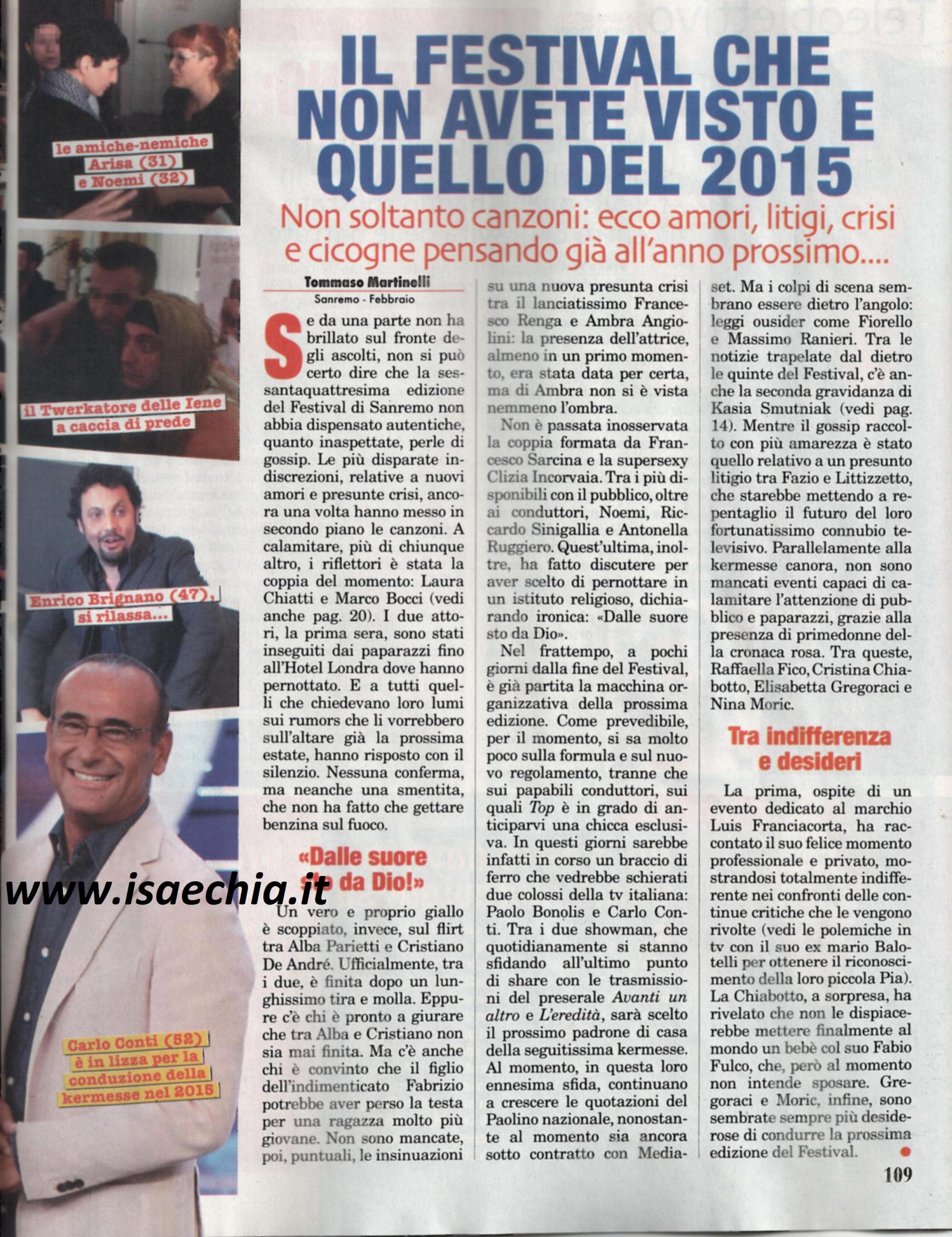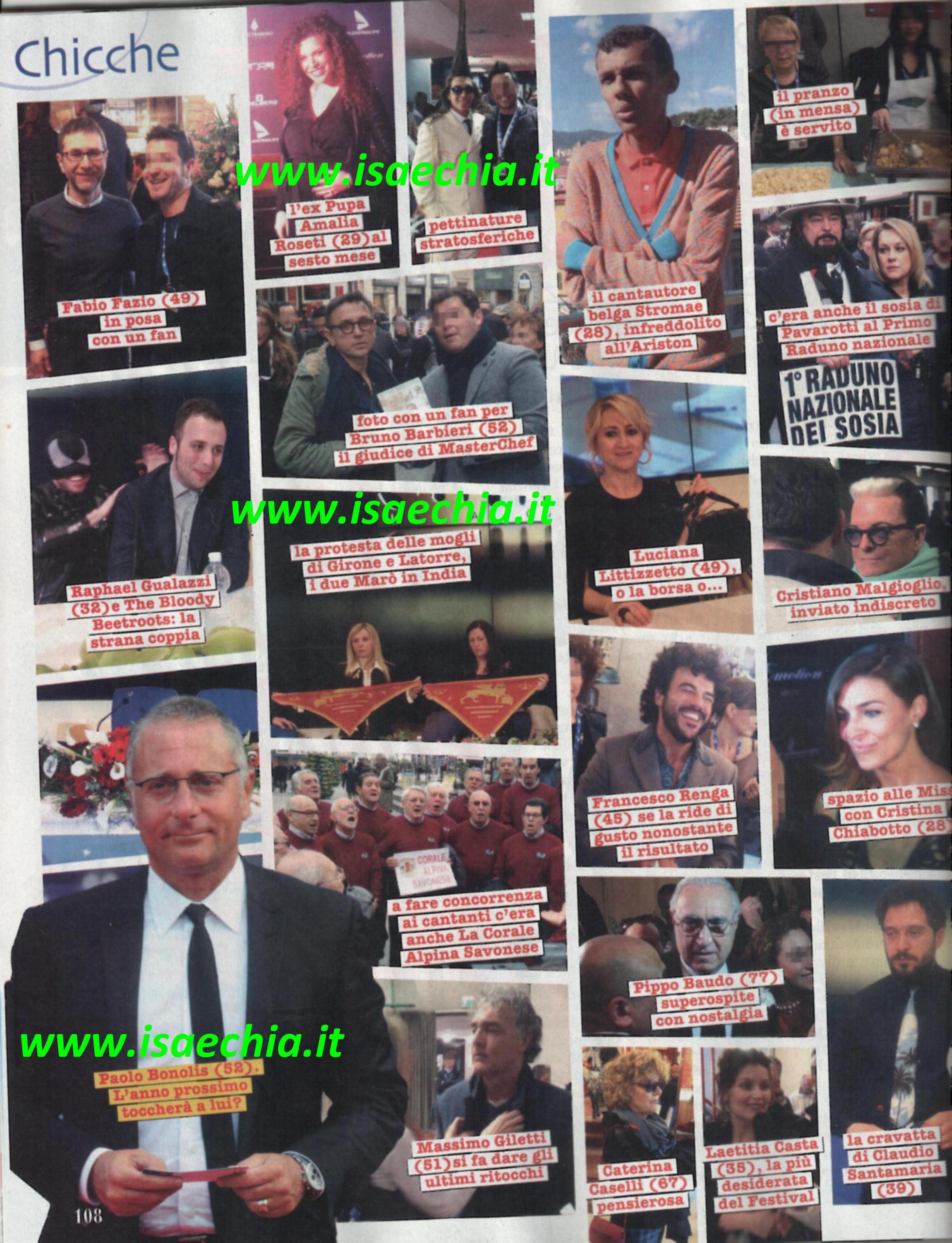 Top, invece, ci mostra il backstage, dove oltre ai cantanti e ai conduttori, erano presenti l’ex corteggiatrice ed ex Pupa Amalia Roseti col pancione, lo storico volto di Sanremo Pippo Baudo, l’ex naufrago Cristiano Malgioglio, e ancora le mogli dei due Marò in India per scioperare. La prima sera ha attirato molta attenzione la coppia del momento, Marco Bocci e Laura Chiatti. Un vero e proprio giallo è nato, invece, su Alba Parietti e Cristiano De André: ufficialmente i due si sono lasciati dopo un lungo tira e molla, eppure c’è chi giura che tra loro non è mai finita e chi che lui abbia perso la testa per una ragazza più giovane. Ancora una volta, c’è la voce di una crisi tra Renga e Ambra Angiolini: di lei non si è vista neanche l’ombra. Non è passata inosservata, invece, la fidanzata di Francesco Sàrcina, Clizia Incorvaia.