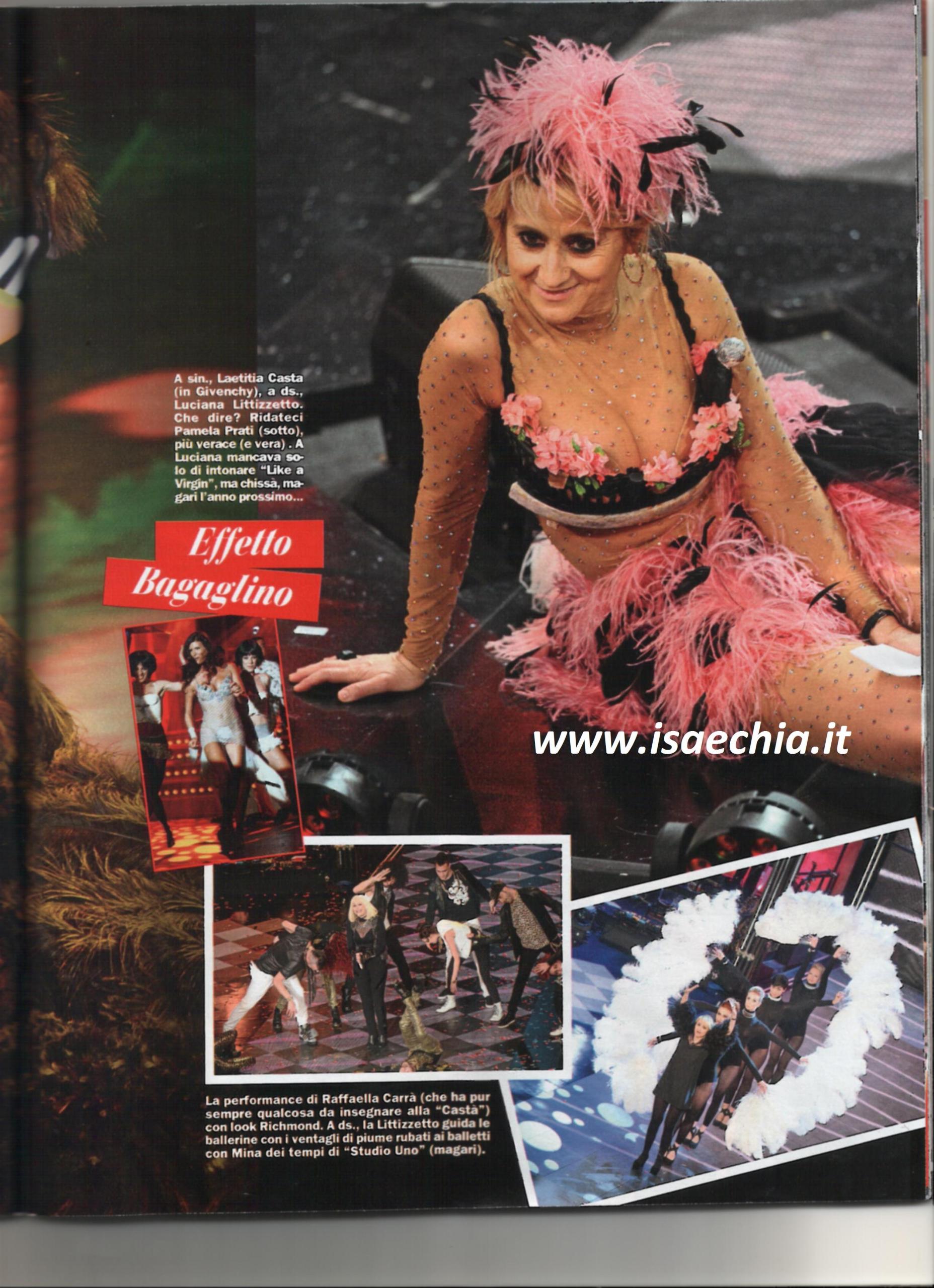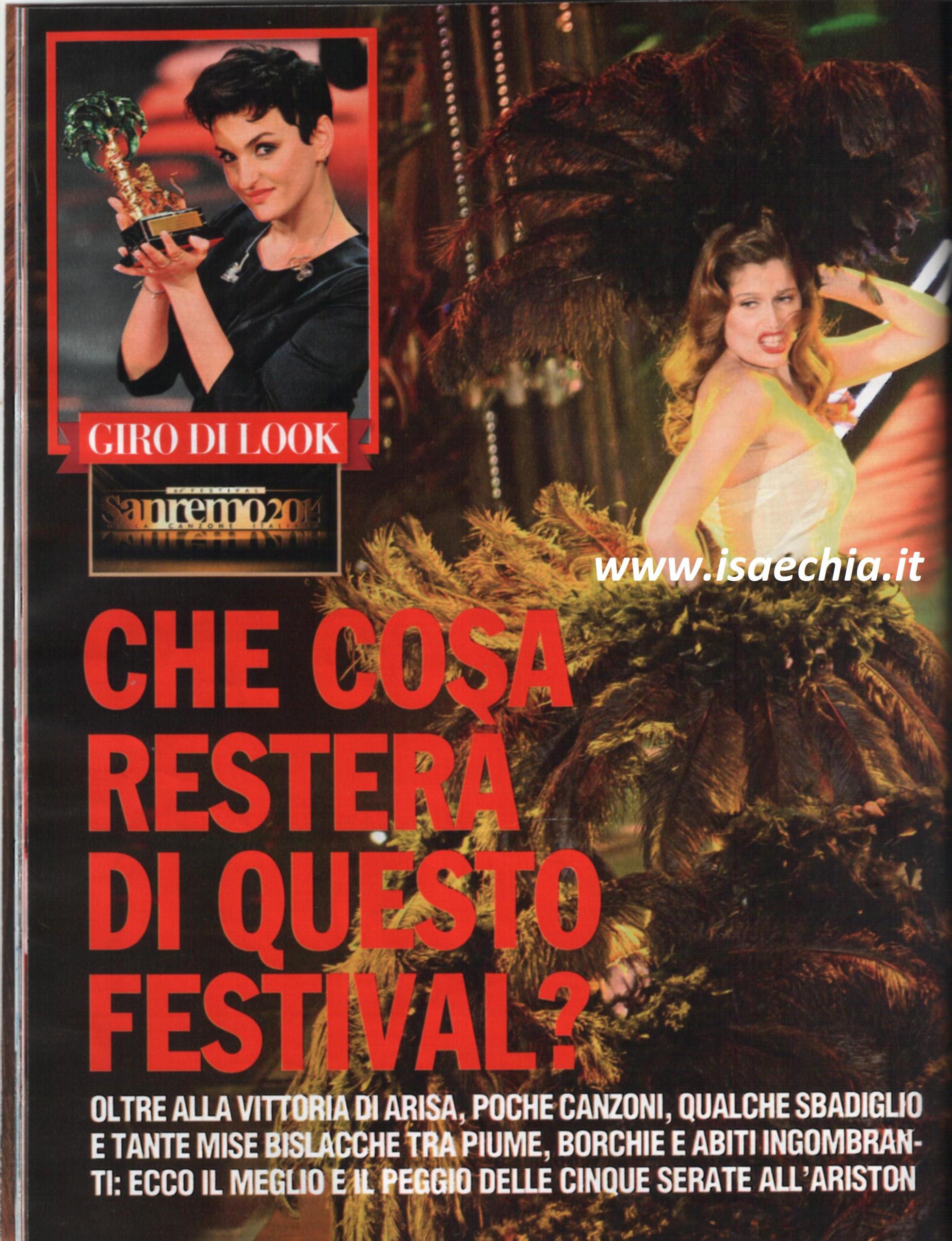 Oltre alla vittoria di Arisa, cosa rimarrà di questo Festival di Sanremo? Secondo Chi, poche canzoni e tante donne in mise bislacche con piume e abiti ingombranti. La mise burlesque di Luciana Littizzetto non è stata la trovata migliore; meglio l’intramontabile Raffaella Carrà, che avrebbe dovuto insegnare qualcosa a Laetitia Casta. Si salva Francesco Renga, nonostante la camicia apertissima: per lui, ci sta. Bella anche la giacca in stile E la nave va di Marco Mengoni; grande la verve di Franca Valeri. Da dimenticare il pigiama di Fabio Fazio, anche se…Meglio così che nudo o in nero triste. Nel “peggio” si annoverano i piedi nudi di Arisa (giustificabili solo se fosse incinta), il colore argentato di Mago Silvan, che lo accomuna a Ligabue e Claudio Baglioni (oltre ad apparire sempre più tirati). Bocciate anche Noemi, Veronica Angeloni e le gemelle Kessler.