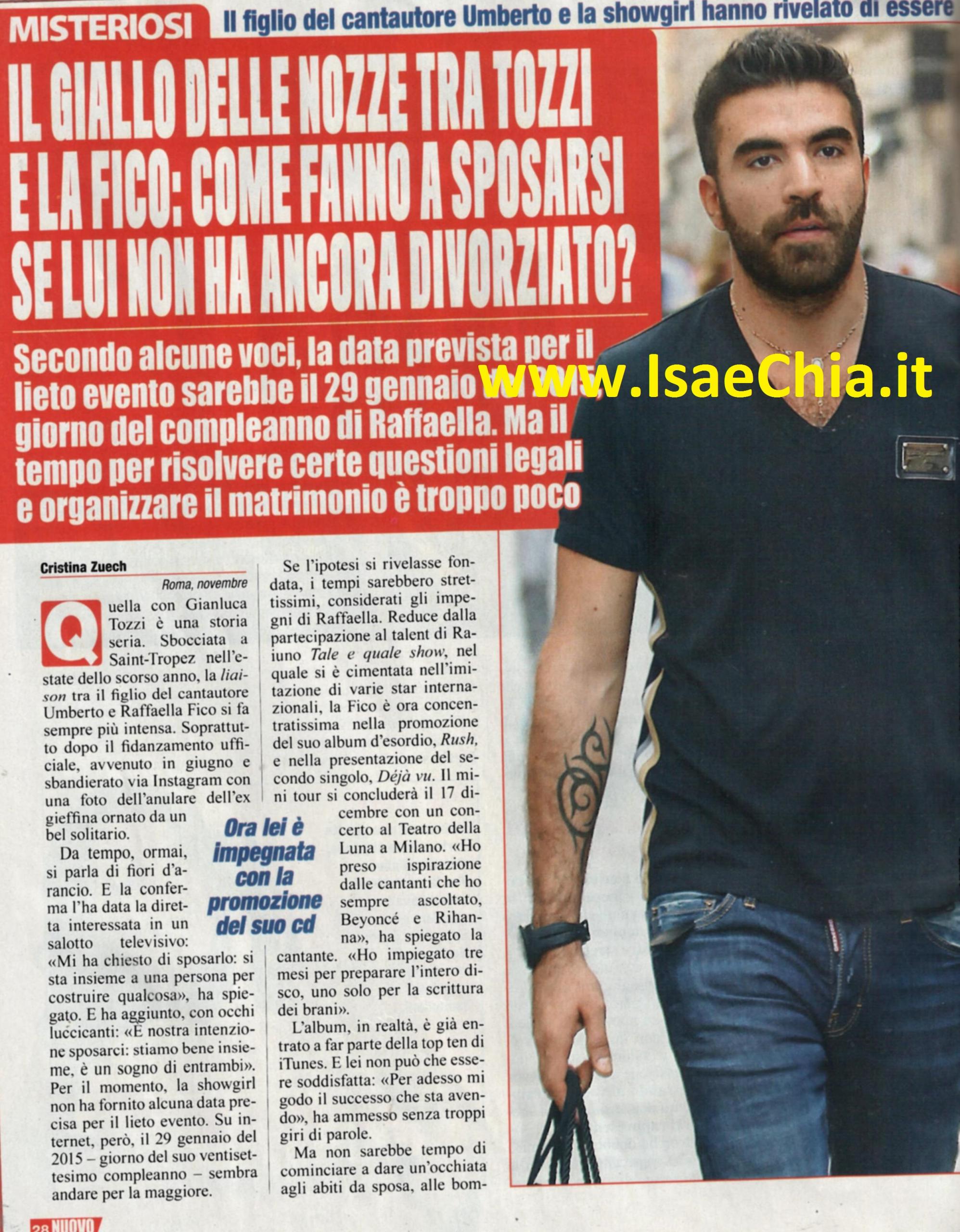 Quella con Gianluca Tozzi è una storia seria e Raffaella Fico l’ha dimostrato fin da subito. E’ nata durante l’estate dello scorso anno, a Saint Tropez ed ha raggiunto il suo culmine (per ora!) con la proposta ricevuta lo scorso giugno, sbandierata via Instagram con un grosso anello. “Mi ha chiesto di sposarlo: si sta insieme ad una persona per costruire qualcosa. E’ nostra intenzione sposarci, stiamo bene insieme entrambi” ha dichiarato l’ex gieffina. Per il momento, però, non ha fornito ancora nessuna data ufficiale per la celebrazione delle nozze. Su internet, però, si fa sempre più forte la voce che la vuole sposa nel giorno del suo 27° compleanno, ossia il prossimo 29 gennaio 2015. Se l’ipotesi fosse fondata, gli impegni per la Fico sarebbero tantissimi, soprattutto se si considera che fino a poche settimane fa è stata impegnata con il programma Tale e quale show e adesso è in giro per promuovere il suo album Rush e il suo secondo singolo, Déjà-vu. “Ho preso ispirazione dalle cantanti che ho sempre ascoltato, come Rihanna e Beyoncé. Ho impiegato tre mesi per la realizzazione dell’album, di cui uno solo per la scrittura dei brani. Per ora mi godo il successo che sta avendo”. Ma non sarebbe ora di cominciare a guardare gli abiti da sposa? O è già tutto pronto? Secondo alcuni, questo matrimonio, in realtà, “non s’ha da fare”: qualche mese fa è trapelata la notizia che Tozzi fosse già sposato con l’ereditiera monegasca Elisa Persoglio, dalla quale ha un figlio, Andrea. Le pratiche per il divorzio sarebbero già state avviate, ma non c’è solo quest’ostacolo. Il padre dello sposo, il cantante Umberto Tozzi, è stato condannato dalla Corte d’Appello a otto mesi di carcere per aver evaso, dal 2005 al 2008, redditi per 800.000 euro. Così, proprio ora che sembravano terminati i suoi problemi, in primis le liti legali con l’ex, Mario Balotelli, padre di sua figlia Pia, si presentano altri problemi. Inoltre, pare che Raffaella sia candidata alla partecipazione al Festival di Sanremo. Un contentino non da poco! E chissà, che invece, non abbia già organizzato tutto…E decida di sposarsi all’improvviso e in segreto come ha fatto Alessia Marcuzzi (leggi QUI l’articolo).