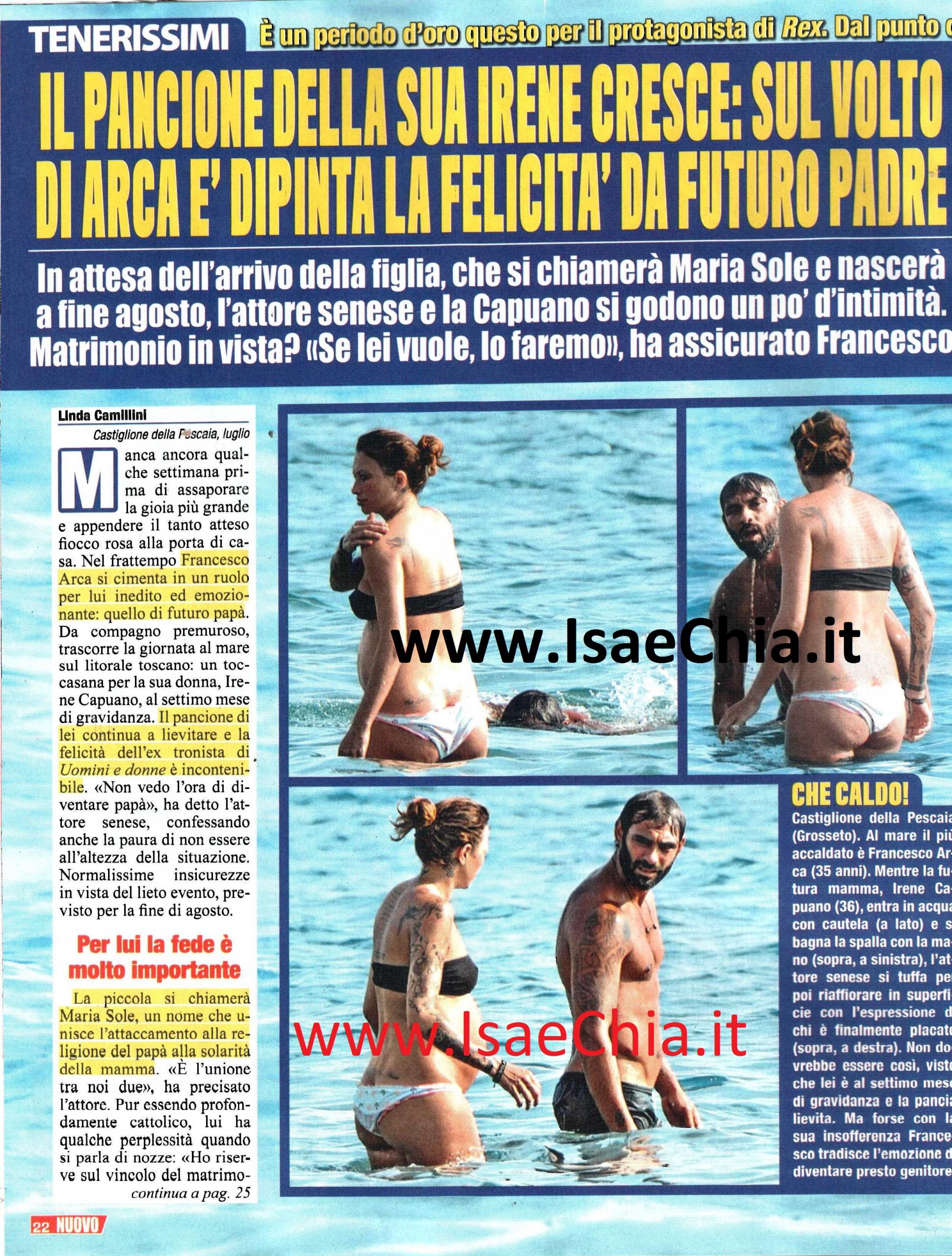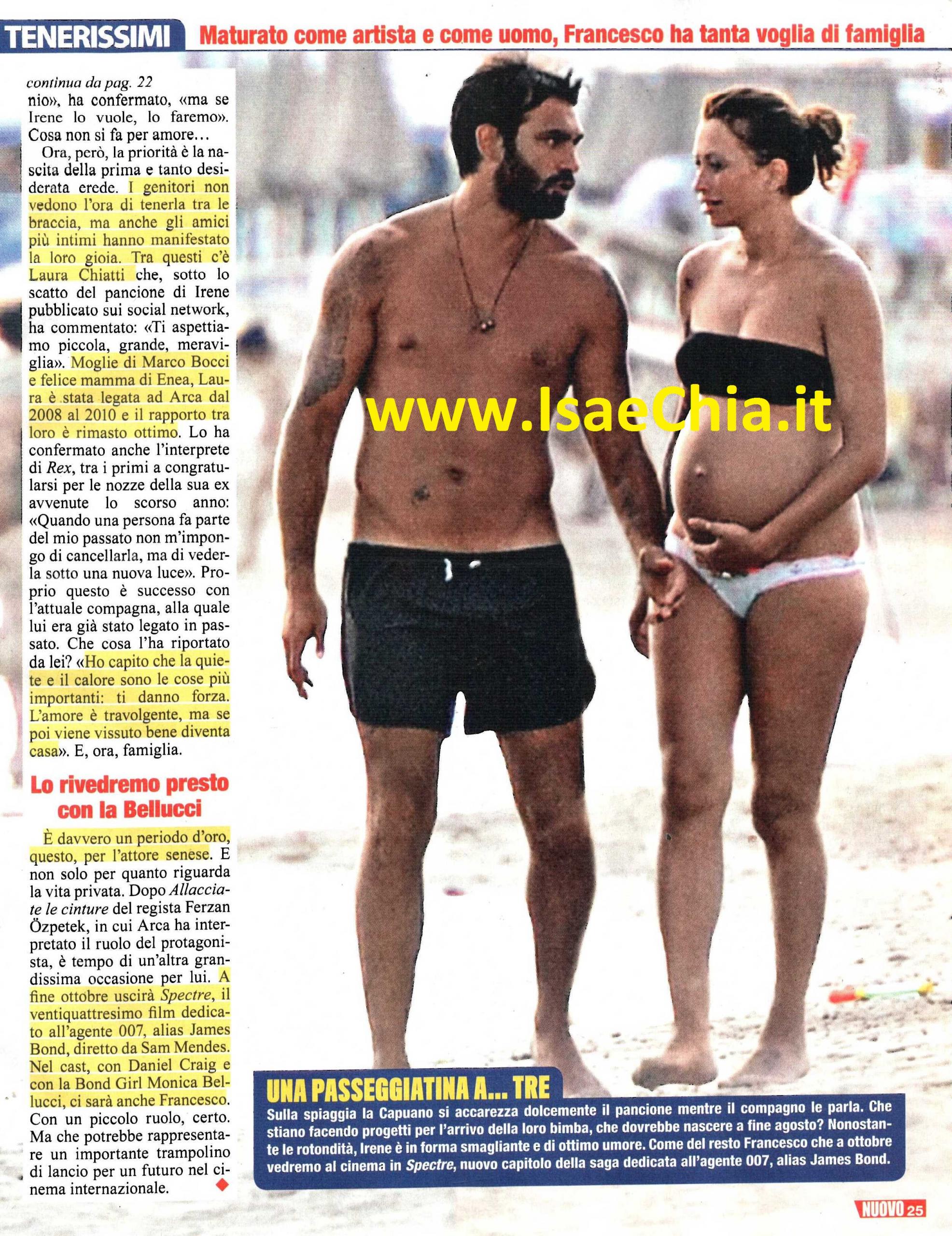 Manca ancora qualche settimana prima di assaporare la gioia più grande e di poter appendere il fiocco rosa fuori la porta di casa. Da compagno premuroso, l’ex tronista Francesco Arca sta trascorrendo le vacanze insieme alla sua Irene Capuano, in quel di Castiglione della Pescaia (Grosseto). Lui si tuffa in mare e va dritto con la testa sott’acqua. Lei, invece, procede con cautela e si bagna prima la spalla. Poi procede a piccoli passi, con il bel pancione da settimo mese che incombe. “Non vedo l’ora di diventare papà” ha detto l’attore senese, che chiamerà la piccola Maria Sole, un nome che unisce l’attaccamento alla religione del papà con la solarità della mamma. “E’ l’unione tra noi due” ha detto l’attore protagonista della fortunata serie Rex. Già, perché i due non hanno proprio parlato di nozze: “Ho riserve sul vincolo del matrimonio, ma se Irene lo vuole, lo faremo” ha detto lui. Ed oltre ai genitori e a tanti amici e parenti, anche una storica ex di Arca ha espresso la sua gioia per la dolce attesa: si tratta di Laura Chiatti, da non molto sposata con il collega attore Marco Bocci e mamma del piccolo Enea, legata a Francesco dal 2008 al 2010. “Ti aspettiamo, piccola grande meraviglia“, ha commentato lei sotto la foto del pancione di Irene. “Quando una persona fa parte del mio passato non mi impongo di cancellarla, ma di vederla sotto una nuova luce” ha detto lui a proposito delle storie passate. Eppure, con Irene, è tornato sui suoi passi, dato che erano stati insieme già in passato: “Ho capito che la quiete e il calore sono le cose più importanti: ti danno forza. L’amore è travolgente, ma se poi viene vissuto bene diventa una casa” ha dichiarato Arca, che vive un momento d’oro. A fine ottobre, infatti, uscirà Spectre, il 24esimo film dedicato all’agente James Bond, in cui i protagonisti saranno Daniel Craig e la star nostrana Monica Bellucci. E ci sarà anche Francesco. Con un piccolo ruolo, vero, ma potrebbe trattarsi di un trampolino di lancio verso un grande futuro.