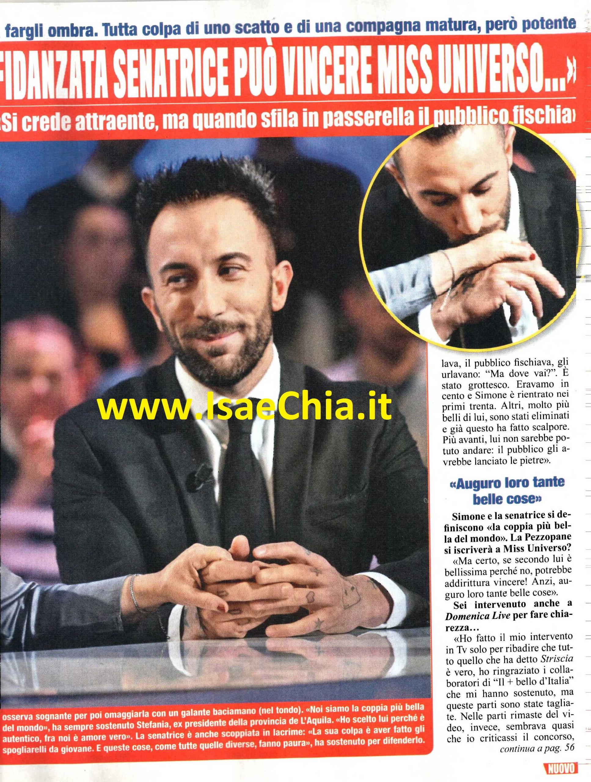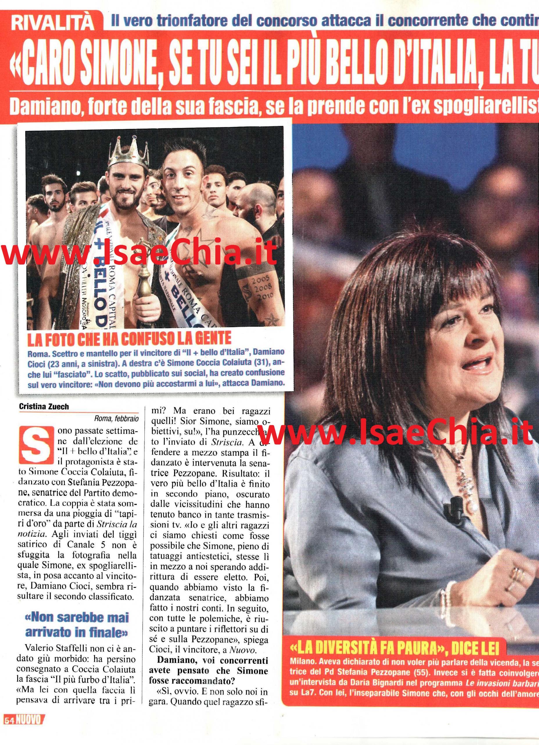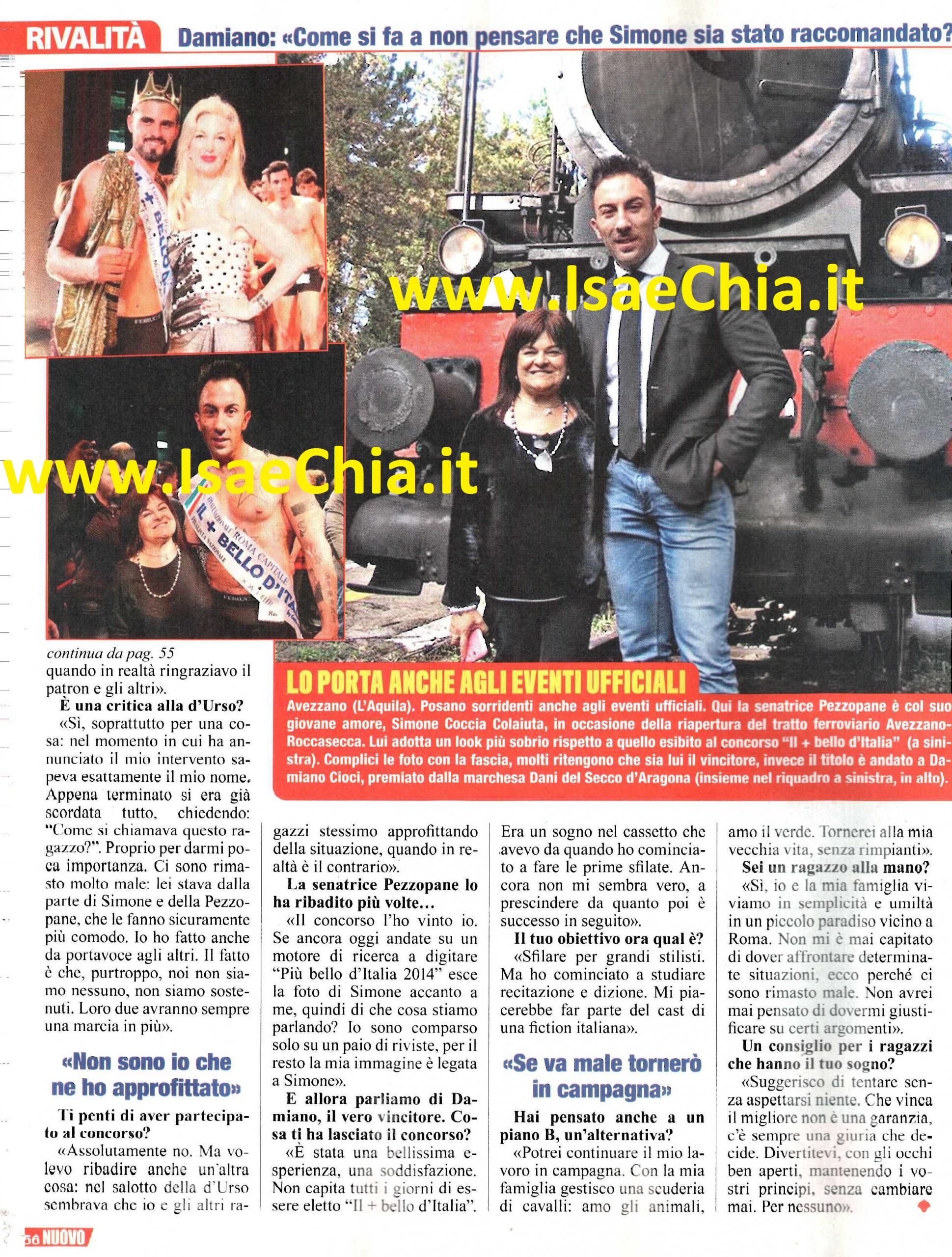Recentemente, ha fatto molto parlare di sé un ragazzo di nome Simone Coccia Colaiuta, che in passato è anche stato corteggiatore a Uomini e Donne: il tretunenne abruzzese, infatti, ha partecipato al concorso di bellezza Il + bello d’Italia, che ha dichiarato vincitore Damiano Cioci. Simone aveva poi dichiarato sui social network di essersi classificato secondo, ma in realtà la fascia che portava nella foto postata gli era stata data dagli sponsor. Questa storia gli ha fatto guadagnare un servizio di Striscia la notizia in cui Valerio Staffelli gli ha consegnato la fascia di “Più furbo d’Italia”, e vari servizi nei salotti pomeridiani di Barbara D’Urso. Proprio in una di queste ospitate, Simone è andato accompagnato dalla sua fidanzata, la senatrice Stefania Pezzopane, 55 anni, ossia ben 24 più di lui. Così, il vincitore Damiano Cioci si è convinto che in realtà, dietro la partecipazione di Simone al concorso ci fosse altro: “Io e gli altri concorrenti ci chiedevamo come fosse possibile che Simone, pieno di tatuaggi antiestetici, stesse in mezzo a noi sperando di essere eletto. Poi, quando abbiamo visto la fidanzata senatrice, abbiamo fatto i nostri conti. In seguito, con tutte le polemiche, è riuscito a puntare tutti i riflettori su di sé e la Pezzopane” dice lui. E continua: “Abbiamo pensato fosse raccomandato, ovvio, ma non solo noi in gara: quando sfilava, la gente fischiava e urlava ‘Ma dove vai?’. Eravamo in 100, ma è entrato nei primi 30, mentre altri molto più belli sono stati eliminati. Più avanti non sarebbe potuto arrivare: il pubblico gli avrebbe gettato le pietre!“. Quando gli si fa notare che Simone e la Pezzopane si sono definiti “la coppia più bella del mondo”, Damiano commenta: “Ma certo, se secondo lui lei è bellissima, potrebbe anche vincere Miss universo! Anzi, auguro loro tante belle cose“. Inoltre, ci tiene a precisare alcune cose: “Sono stato a Domenica Live per confermare ciò che aveva scoperto Striscia e ringraziare chi mi ha sostenuto, ma queste parti sono state tagliate e nel video sembrava che criticassi il concorso. E’ una critica nei confronti di Barbara D’Urso, che al momento di presentarmi, sapeva perfettamente il mio nome, mentre appena terminato il video ha detto ‘Come si chiamava questo ragazzo?’, proprio per darmi poca importanza. Ci sono rimasto molto male. Lei è dalla parte di Simone e della Pezzopane, che sicuramente le fa più comodo. Nel salotto della D’Urso sembrava che io e gli altri ragazzi stessimo approfittando della situazione, quando in realtà è il contrario…Il concorso l’ho vinto io, eppure se cercate su internet ‘Più bello d’Italia 2014‘ esce la foto di Simone accanto a me“. Infine, il modello 23enne si racconta: “Era un sogno nel cassetto che avevo fin da quando ho cominciato con le prime sfilate; non capita tutti i giorni di vincere ‘Il più bello d’Italia’ e non mi sembra ancora vero. Adesso spero di lavorare con grandi stilisti, ma ho cominciato a studiare recitazione e dizione, sperando di poter recitare in una fiction italiana. Il mio piano B? Tornare alla vita di campagna: con i miei gestisco una scuderia di cavalli. Io e la mia famiglia viviamo in semplicità e umiltà in un piccolo paradiso vicino Roma, non mi è mai capitato di dover affrontare situazioni simili, ecco perché ci sono rimasto così male. Il mio consiglio a chi ha il mio sogno è non aspettarsi niente: non sempre vince il migliore. Divertitevi, mantenendo i vostri valori, senza cambiare mai per nessuno”.