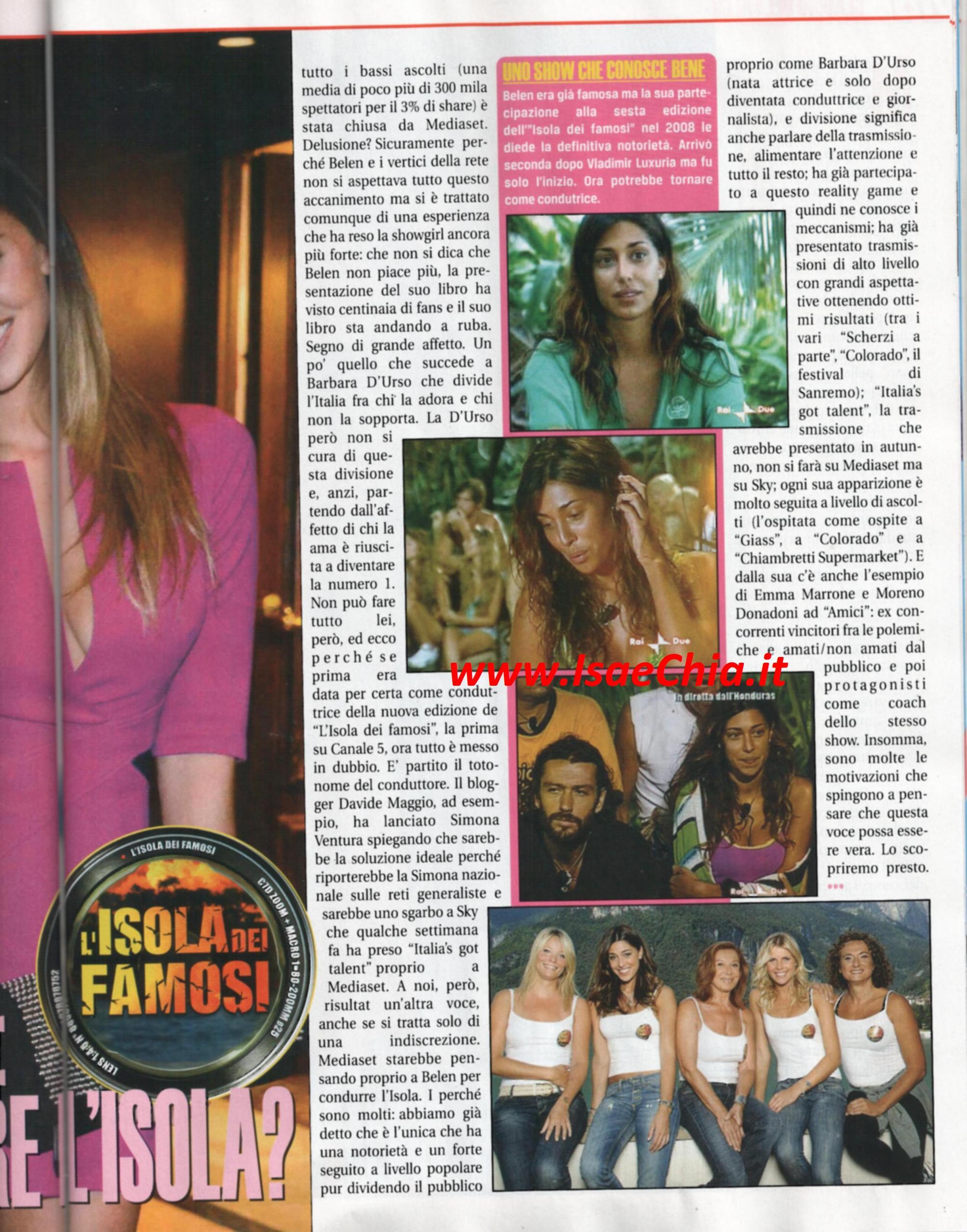 Che L’isola dei famosi stesse per tornare si sapeva. La voce che passerà a Mediaset è ormai data per certa. Ma che alla conduzione ci potesse essere Belén Rodriguez, lanciata proprio dallo stesso reality, non l’aveva ancora pensato nessuno. Belén ha subìto una recente sconfitta con il suo programma Come mi vorrei, un po’ simile a quelli di Enzo Miccio e Carla Gozzi, a Detto fatto o a Il brutto anatroccolo, ma criticato perché giudicato maschilista e un vero flop di ascolti, con una media di 300.000 ascoltatori e 3% di share. Ma che non si dica che Belén non piace più: il suo libro sta andando a ruba e c’è chi la ama e chi non la sopporta, un po’ come vale per la sua “nemica” Barbara D’Urso. E proprio quest’ultima era stata data come conduttrice dell’Isola, ma da un po’ si sono mischiate le carte in tavola. Il blog di Davide Maggio propone come conduttrice Simona Ventura, una sorta di “sgarbo” di Mediaset che ha ceduto a Sky Italia’s got talent e in cambio prenderebbe la Ventura. Secondo altri, invece, Mediaset avrebbe proposto a Belén Rodriguez la conduzione dell’Isola. E’ l’unica ad avere tanto riscontro dal pubblico, nonostante la divisione di quest’ultimo. In ogni caso, il fatto che il pubblico sia diviso nei suoi confronti, creerebbe curiosità; ha già partecipato a questo game e ne conosce i meccanismi e si è già misurata con programmi di questo livello (Colorado, Scherzi a parte). E, un po’ come Emma Marrone e Moreno Donadoni ad Amici, potrebbe tornare in altre vesti nel programma che l’ha lanciata.