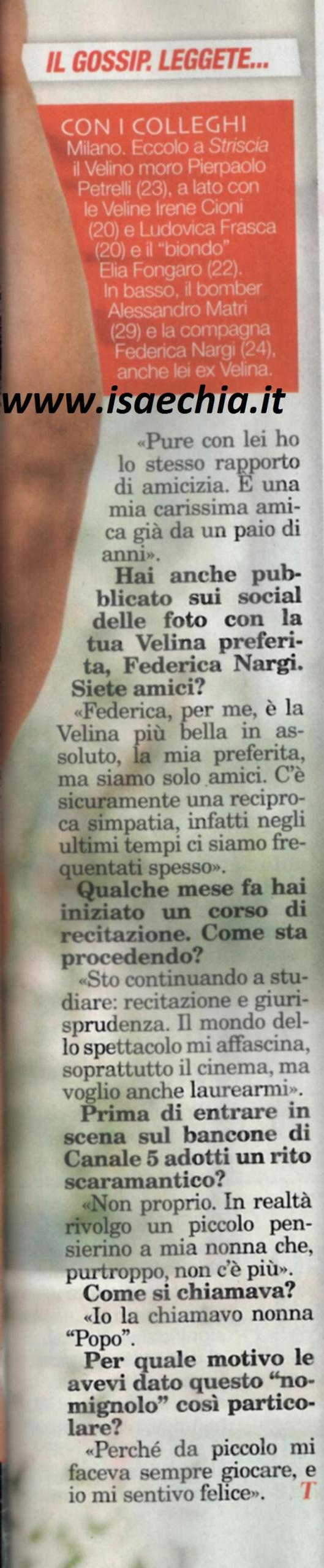 Il velino moro Pierpaolo Pretelli ha sorpreso il pubblico di Striscia insieme al collega biondo Elia Fongaro a settembre e ogni tanto il duo torna nel programma: “Non credo che ci sia voluto molto perché noi Velini entrassimo nelle grazie del pubblico. Anzi, credo che siamo stati subito apprezzati, soprattutto dalle ragazze. Se torniamo a Striscia vuol dire che abbiamo avuto successo. Io e Elia ci sentiamo e abbiamo un rapporto fantastico, fraterno. Credo sia dovuto alla differenza caratteriale e di origine”. Quando gli si chiede dell’ex Velina bionda Giulia Calcaterra, con la quale è stato visto in giro, dice: “Non è vero che abbiamo avuto un flirt. E’ solo un’amica” e dice lo stesso anche per le altre: “Anche Paola Caruso, la “Bonas” di Avanti un altro è una mia carissima amica, ma già da un paio d’anni! Federica Nargi? Per me è la Velina più bella, ma c’è solo un’amicizia, un rapporto di reciproca simpatia, infatti negli ultimi tempi ci siamo frequentati spesso”. Così, dopo aver parlato dei suoi progressi nello studio della recitazione, che compie parallelamente agli studi in Giurisprudenza, rivela per chi è il suo cuore: “Prima di andare in onda rivolgo un piccolo pensiero a mia nonna, che ora non c’è più. Io la chiamavo nonna Popo: da piccolo mi faceva sempre giocare e io mi sentivo felice”.