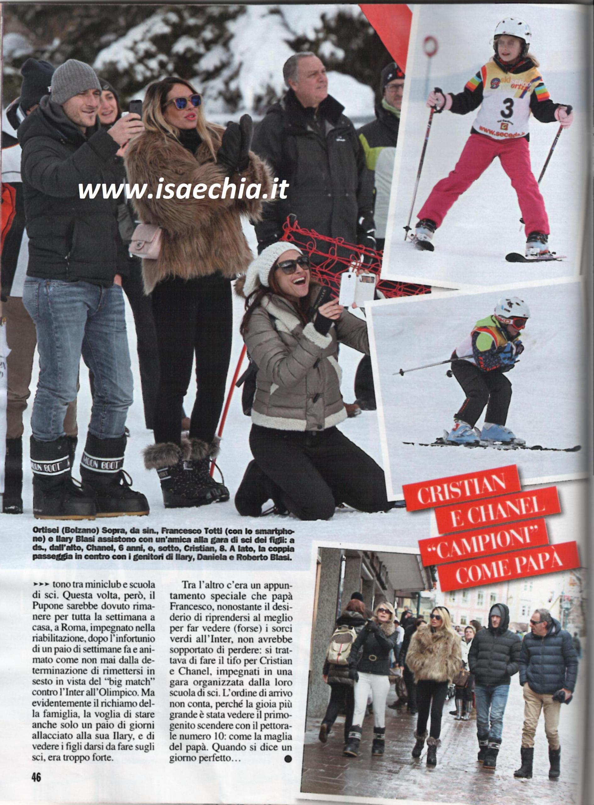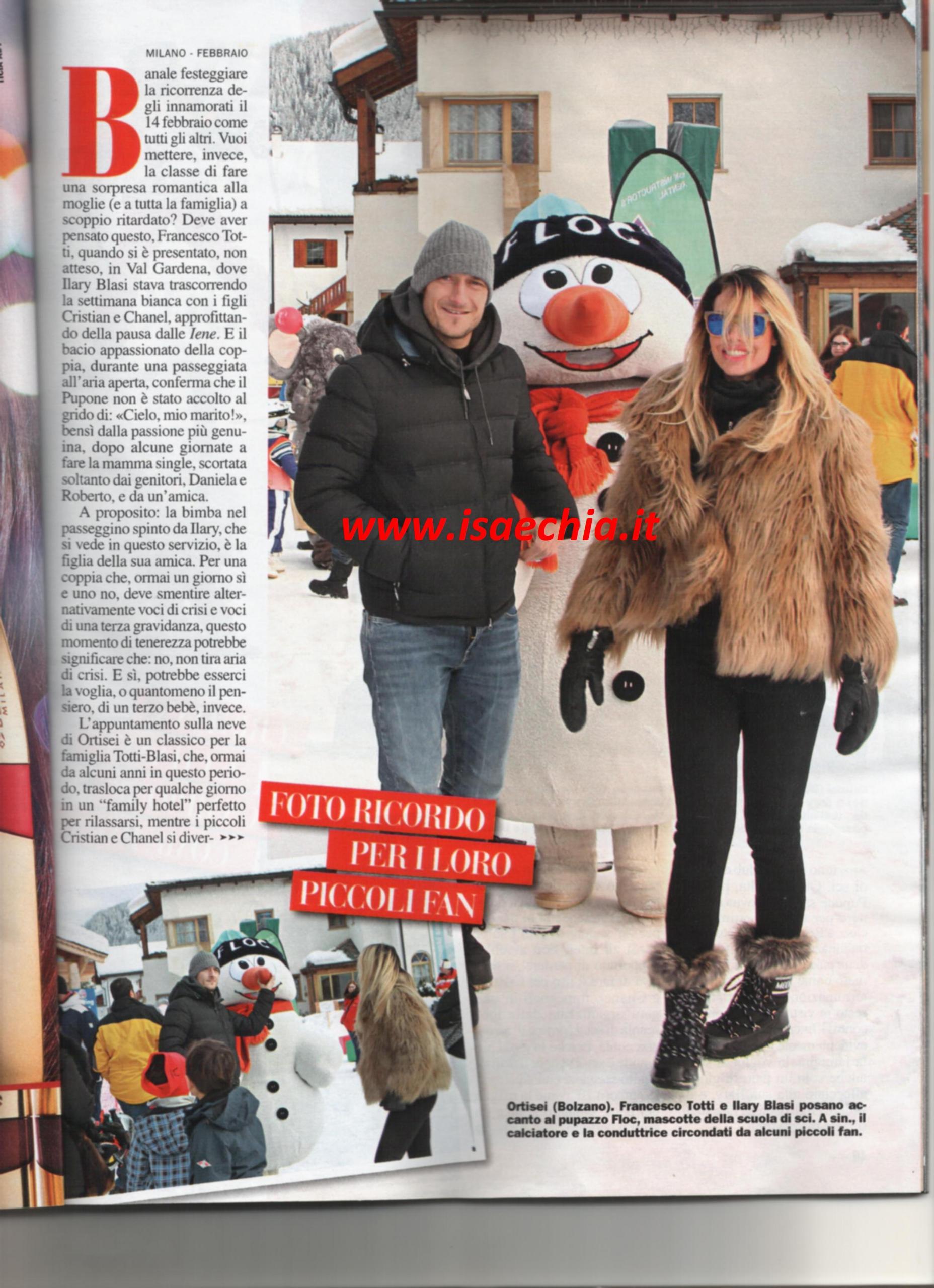 Festeggiare San Valentino come tutti gli altri è troppo banale: ecco cosa deve aver pensato il calciatore Francesco Totti, quando ha deciso di sorprendere sua moglie Ilary Blasi raggiungendola in Val Gardena, dove la conduttrice de Le Iene era già con i figli Christian e Chanel. I due devono smentire una settimana sì e una no che la loro relazione è in crisi e stavolta lo dimostrano direttamente coi fatti. La bimba che Ilary porta nel passeggino non è la loro secondogenita, bensì la figlia di un’amica, ma ha fatto tornare la voce della voglia di una terza maternità di Ilary. L’appuntamento sulle nevi di Ortisei è un classico per la coppia, che da qualche anno si trasferisce in un family hotel. Stavolta, però, il Pupone sarebbe dovuto rimanere a Roma a causa del recente infortunio e della riabilitazione necessaria, ma evidentemente la voglia di rivedere la sua amata era tanta e non ha resistito. E poi, c’era un evento che papà Francesco non poteva perdere: doveva fare il tifo per Christian e Chanel, impegnati in una gara organizzata dal loro corso di sci.