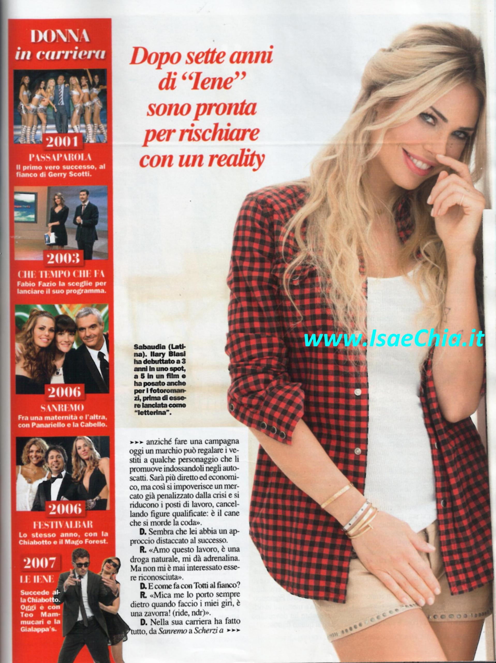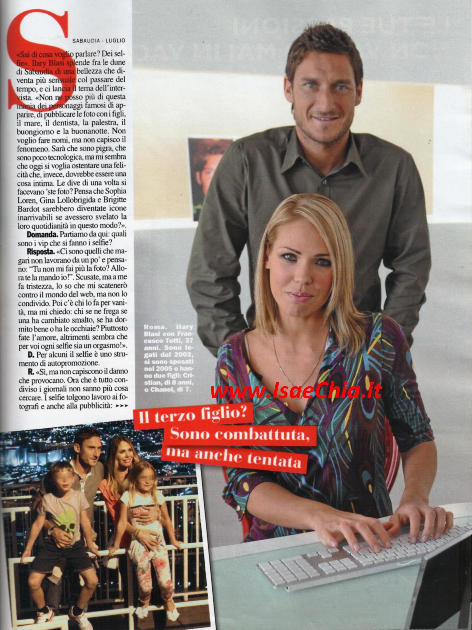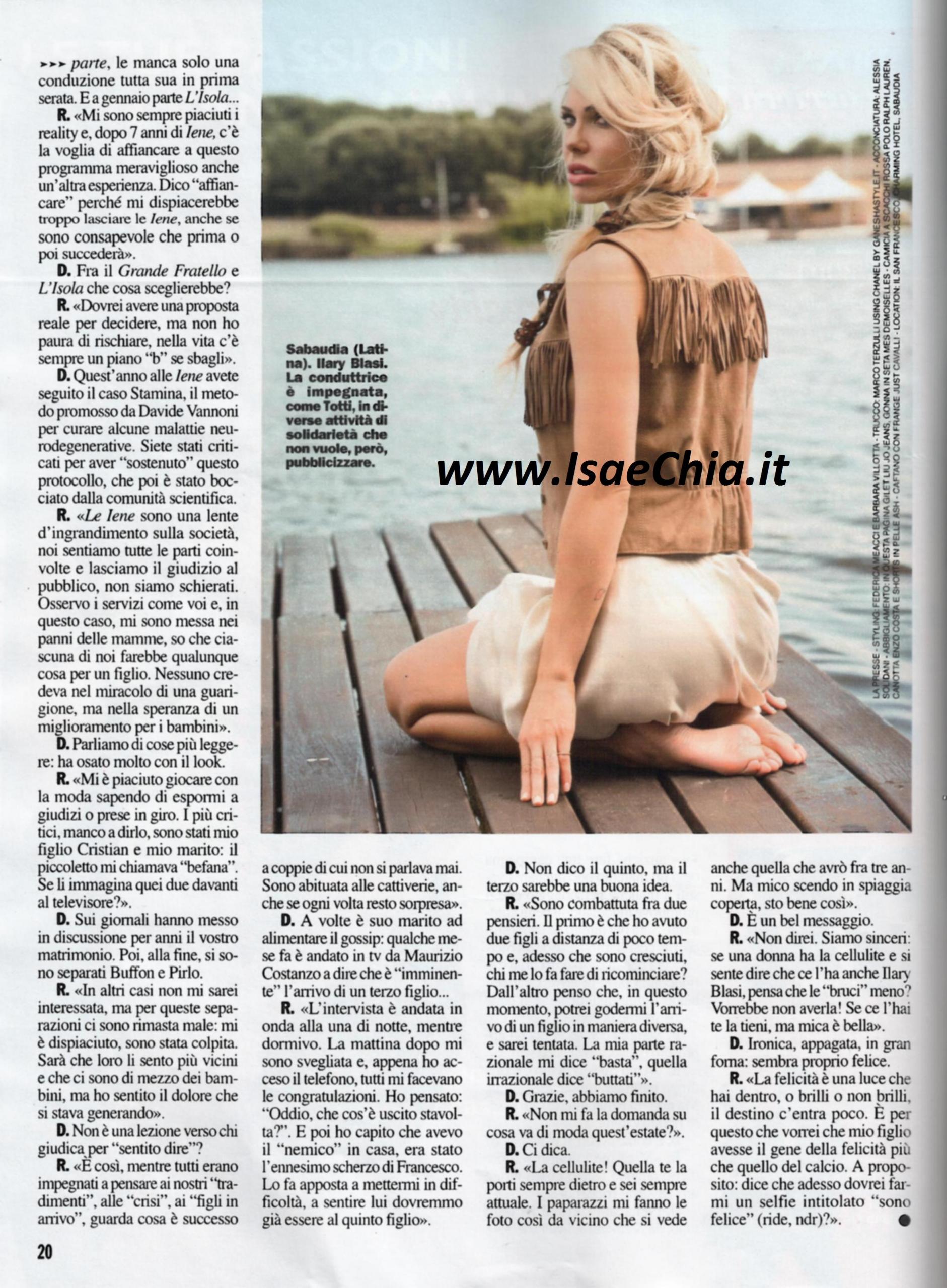 “Sai di cosa voglio parlare? Dei selfie” esordisce così Ilary Blasi, scegliendo la moda del momento, per iniziare la sua intervista. “Non ne posso più di questa mania dei personaggi famosi di apparire, di pubblicare la foto con i figli, in palestra, il buongiorno, la buonanotte. Non voglio fare nomi, ma non capisco il fenomeno. Sarà che sono pigra, o non troppo tecnologica, ma mi sembra che si voglia ostentare una felicità che invece dovrebbe restare intima. Le dive di una volta si facevano ste foto? Pensate che Sophia Loren, Gina Lollobrigida e Brigitte Bardot sarebbero diventate icone arrivabili se avessero svelato la loro quotidianità in questo modo? Ci sono quelli che magari non trovano lavoro da un po’ e pensano: “Non mi fotografano? Lo faccio io”. Scusate, ma a me fa tristezza. Lo so, mi scatenerò il mondo del web contro, ma non lo condivido. Poi c’è chi lo fa per vanità. Ma che ce ne frega se avete cambiato smalto o se avete le occhiaie? Piuttosto fate l’amore, altrimenti sembra che per voi ogni selfie sia un orgasmo! Ora che tutto è condiviso, i giornali non sanno che fare. I selfie tolgono lavoro ai fotografi e alla pubblicità: anziché fare una campagna, i marchi possono promuoversi regalando i vestiti ai personaggi che si fanno autoscatti. Così s’impoverisce ancora di più un mercato già in crisi, è un cane che si morde la coda”. Ma quando le si chiede cose un po’ più serie, come se è pronta per fare il “salto di qualità” e condurre un reality, risponde: “Mi sono sempre piaciuti e dopo 7 anni a Le Iene vorrei affiancarvi anche un’altra esperienza. Dico “affiancare” perché mi dispiacerebbe troppo lasciare Le Iene, anche se so che prima o poi succederà. Tra Grande fratello e L’isola dei famosi non saprei scegliere, dovrei avere la proposta reale per decidere, ma non ho paura di rischiare”. Poi dopo aver parlato del caso Stamina (“Mi sono messa nei panni delle mamme, so che ciascuna di noi farebbe qualsiasi cosa per il proprio figlio. Nessuno sperava nella guarigione, ma almeno in un miglioramento per quei bambini”) e dei suoi look, quando le si chiede di commentare le fini dei matrimoni di Gigi Buffon e di Andrea Pirlo, calciatori colleghi di suo marito Francesco Totti, risponde: “In altri casi non mi sarei interessata, ma per queste separazioni ci sono rimasta male, sarà che li sento più vicini e che ci sono di mezzo dei bambini. Così, mentre tutti erano impegnati a pensare ai “tradimenti”, alle “crisi” e ai “figli in arrivo” miei, guarda cosa è successo alle coppie di cui non si parlava mai”. E, a proposito, Ilary commenta così il gossip generato da suo marito Totti sull’arrivo di un terzo figlio, che aveva dichiarato “imminente”: “L’intervista da Maurizio Costanzo andò in onda di notte. La mattina, mi sono ritrovata dei messaggi di congratulazioni e poi ho capito che il “nemico” ce l’avevo in casa! Lo fa apposta per mettermi in difficoltà! La verità è che sono combattuta: ho avuto due figli a breve distanza, e ora che sono cresciuti, chi me lo fa fare di ricominciare? Dall’altro lato, penso che potrei godermi un terzo figlio in modo diverso e sono tentata”. Infine, l’ex Letterina parla della vera moda dell’estate: “La cellulite! Quella te la porti sempre dietro. I paparazzi mi fanno foto così da vicino che si vede anche quella che avrò tra tre anni! Ma io non mi copro, sto bene così. Un bel messaggio? Siamo sinceri, se una donna vede che anche Ilary Blasi ha la cellulite, pensa che le bruci meno? Vorrebbe non averla comunque!”