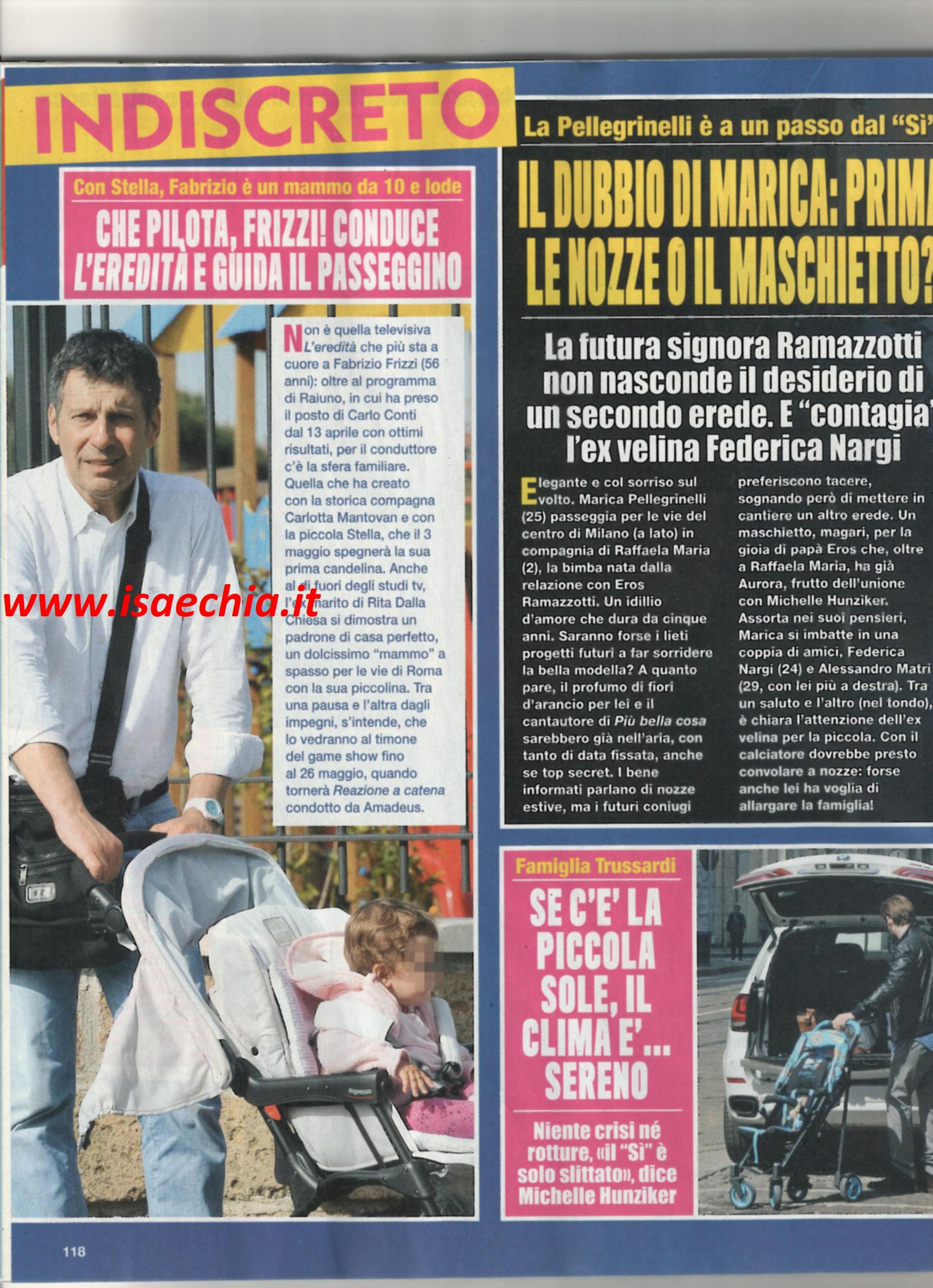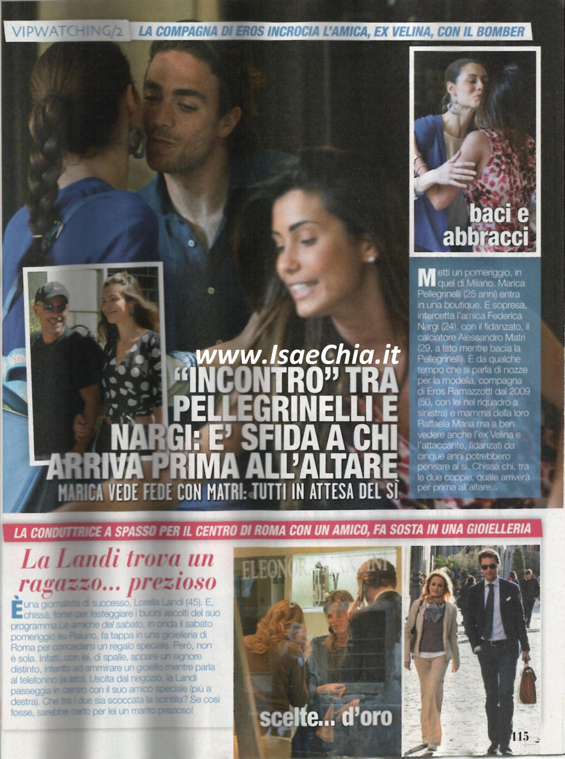 La compagna del cantante Eros Ramazzotti, Marica Pellegrinelli, era in giro per Milano con la figlia Raffaela Maria, quando, entrando in una boutique, ha incontrato una vecchia amica, l’ex Velina Federica Nargi, anche lei in giro con il fidanzato, il calciatore Alessandro Matri. L’attenzione della bella Federica è ricaduta subito sulla piccola, alla quale ha dedicato i suoi sorrisi. Che cominci a sentire l’istinto materno che scalpita? Da anni ormai, le voci delle nozze tra la Pellegrinelli e Ramazzotti si rincorrono e si fanno sempre più insistenti e pare che convoleranno a nozze entro l’anno. Anche Federica e il suo attaccante sono fidanzati da ben cinque anni e potrebbero pensare al sì. Chi delle due arriverà prima all’altare?