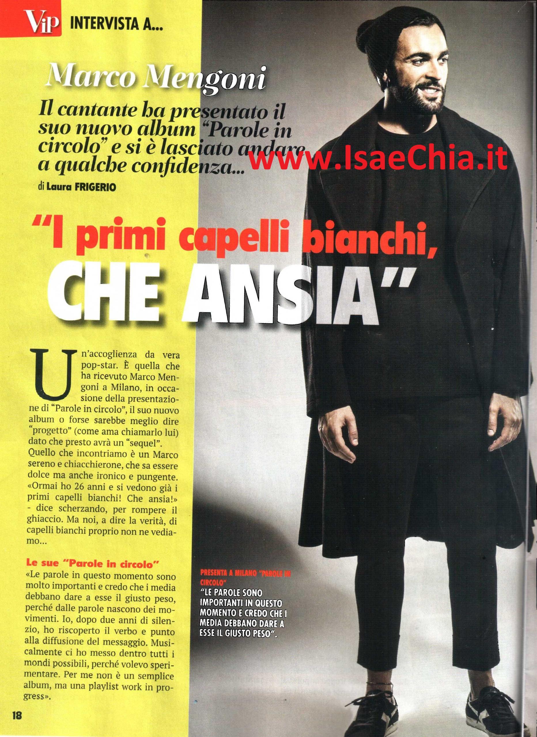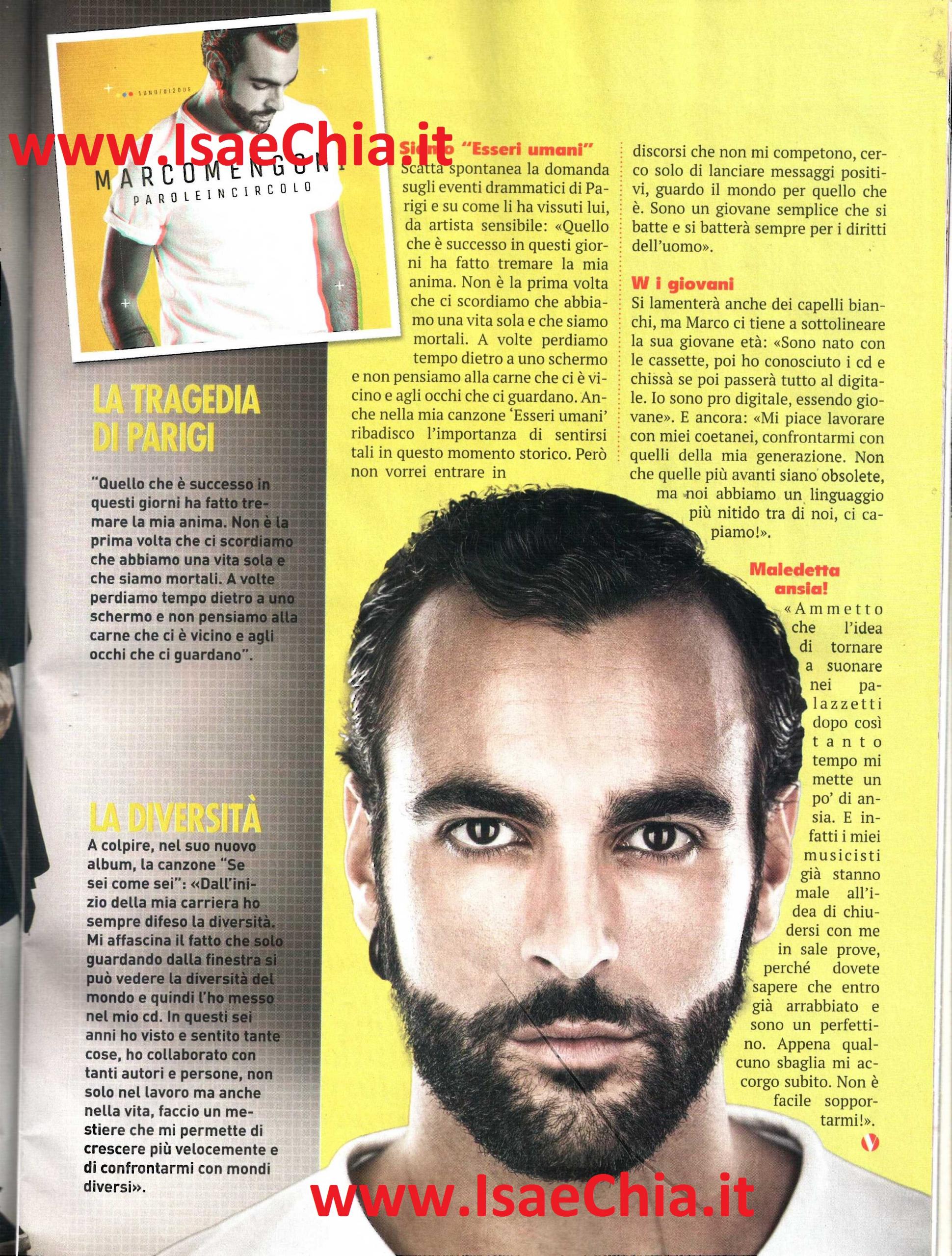 Un’accoglienza da vera pop-star, quella ricevuta da Marco Mengoni a Milano in occasione del suo nuovo lavoro Parole in circolo, che è parte di un “progetto”, come ama chiamarlo lui, che avrà un seguito in un secondo album. “Le parole in questo momento sono molto importanti e credo che i media debbano dare a esse il giusto peso, perché dalle parole nascono dei movimenti. Dopo due anni di silenzio, ho riscoperto il verbo e punto alla diffusione del messaggio. Musicalmente ho messo insieme tutti i mondi possibili perché volevo sperimentare: non è un album, ma una playlist “work in progress”. Dall’inizio della mia carriera ho sempre difeso la diversità, mi affascina il fatto che solo guardando dalla finestra si possa vedere la diversità e l’ho messo nel mio cd. In sei anni ho visto tante cose, collaborato con tante persone, non solo nel lavoro ma anche nella vita. Faccio un mestiere che mi permette di crescere più velocemente e di confrontarmi con mondi diversi” dichiara lui. Chiedendogli degli ultimi, tragici eventi di Parigi, ossia l’attentato al settimanale Charlie Hebdo, il vincitore di X Factor commenta: “Ha fatto tremare la mia anima. Non è la prima volta che dimentichiamo che abbiamo una vita sola e che siamo mortali; a volte ci perdiamo dietro uno schermo e non pensiamo alla carne che ci è vicino e agli occhi che ci guardano. Nella mia canzone Esseri umani ribadisco l’importanza di sentirsi tali in questo momento storico, però non vorrei entrare in discorsi che non mi competono. Sono un giovane semplice che si batte e si batterà sempre per i diritti dell’uomo” dice lui, nonostante appena lo si incontri, scherzi proprio sulla sua età: “Ho 26 anni e iniziano a vedersi i capelli bianchi. Che ansia! Sono nato con le cassette, poi ho visto i cd e chissà se passerà tutto al digitale! Io sono pro-digitale, sono giovane! Mi piace lavorare con i coetanei, confrontarmi con la mia generazione. Non che quelle più avanti siano obsolete, ma noi abbiamo un linguaggio più nitido, tra di noi ci capiamo“. Infine, guardando al prossimo tour, rivela: “L’idea di tornare nei palazzetti dopo così tanto tempo mi mette un po’ d’ansia. I musicisti stanno già male all’idea di chiudersi con me in sala prove, perché entro già arrabbiato e sono un perfettino! Appena qualcuno sbaglia…Me ne accorgo subito. Non è facile sopportarmi!“.