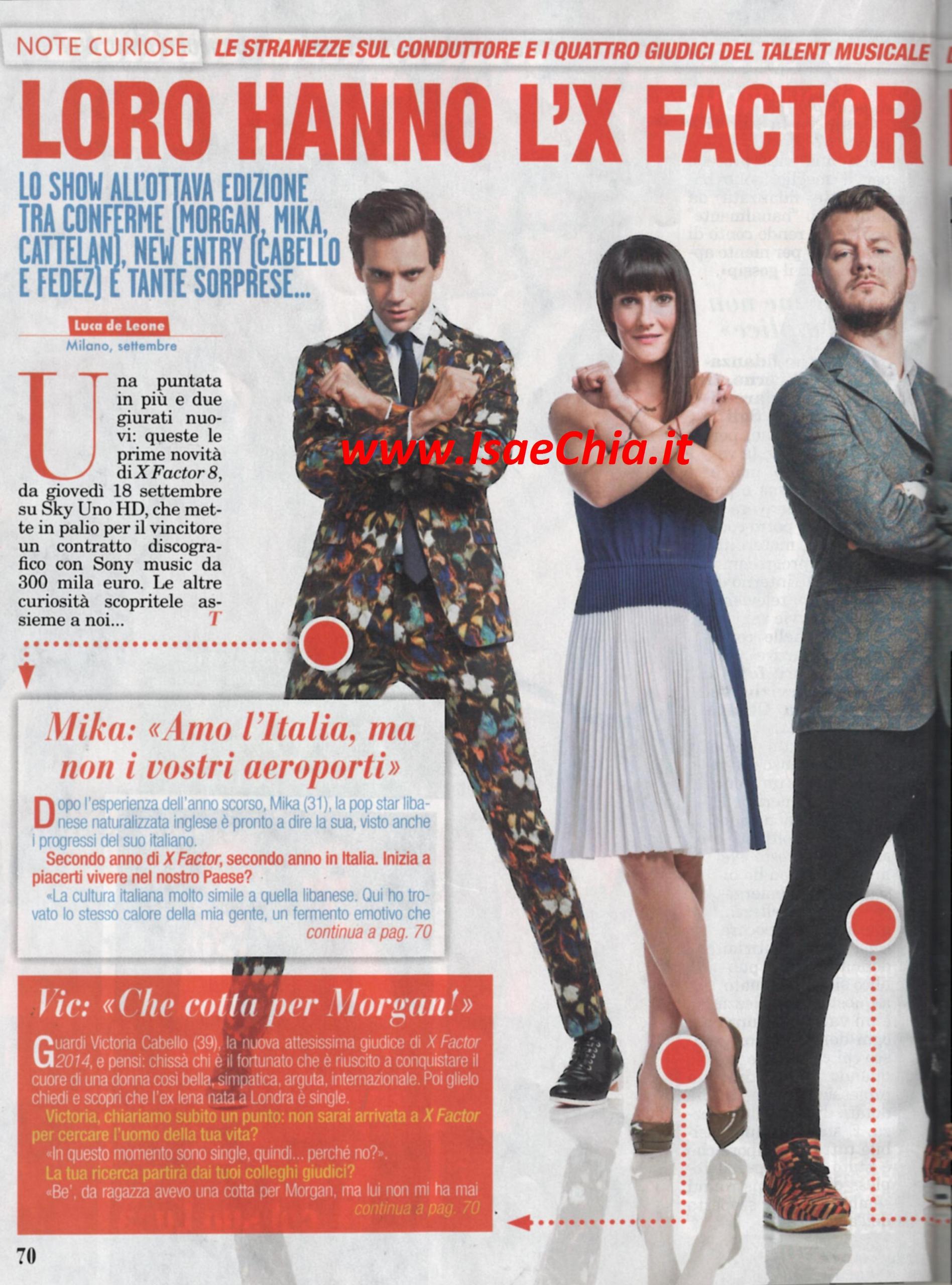 La popstar Mika racconta: “La cultura italiana è simile a quella libanese, trovo lo stesso calore della mia gente, un fermento emotivo che si declina nella musica. Degli Italiani condivido anche la capacità di pensare sempre positivo, anche in campo economico e politico. Matteo Renzi? E’ giovane, mi incuriosisce e svolgerà un ruolo importante, anche in Europa. Cosa non mi piace dell’Italia? Gli aeroporti: sono bruttissimi. Non come quelli americani, ma siamo vicini”. E, dopo aver confermato che il suo cuore batte per qualcuno, quando gli si fa notare che invece Victoria è single, commenta: “Se una come lei è single, allora non c’è speranza per nessuna ragazza della sua età!”.