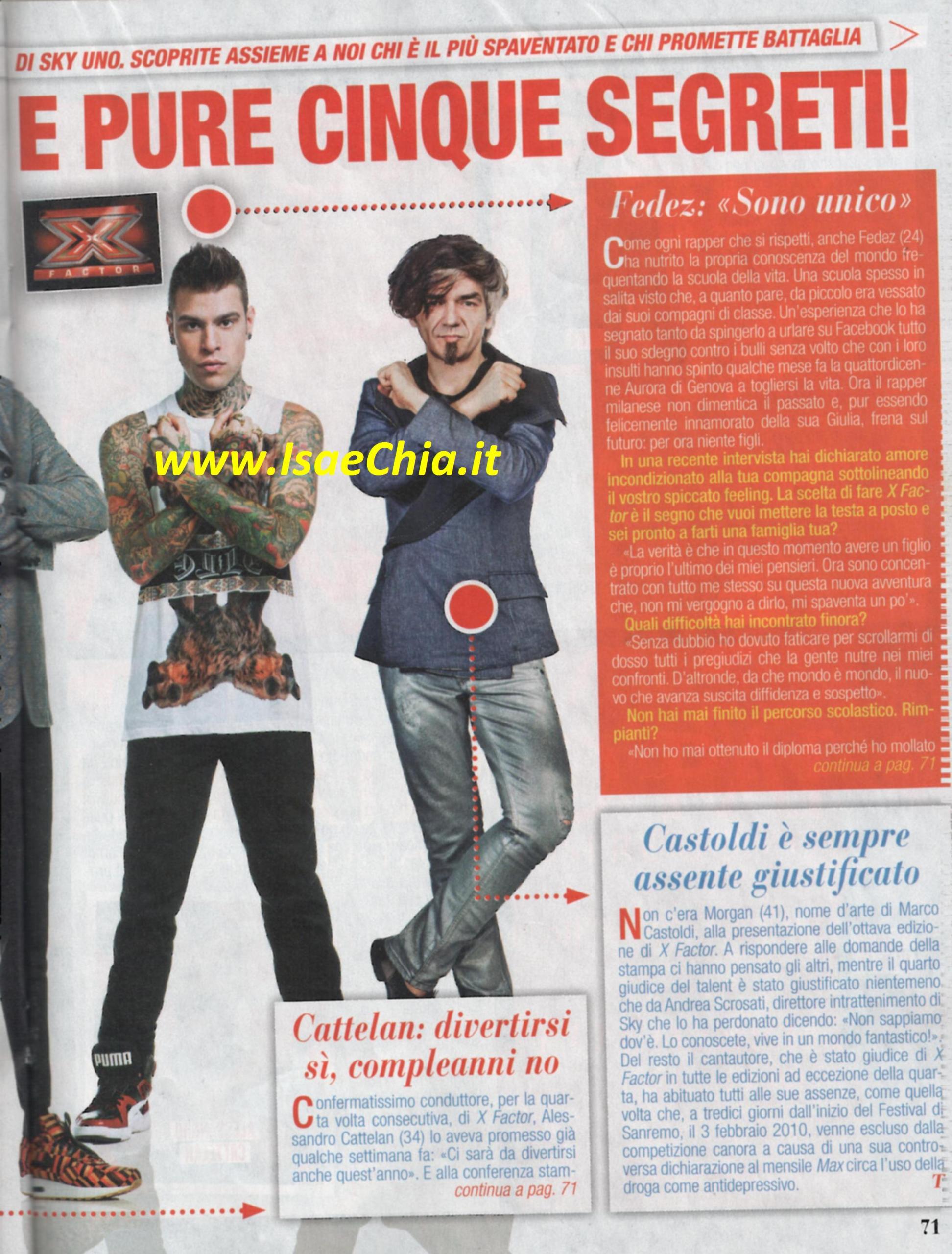 Il rapper milanese, invece, è fidanzatissimo con Giulia. Quando gli si chiede se fare il giudice ad X Factor sia l’occasione giusta per mettere la testa a posto, risponde: “In questo momento avere un figlio è l’ultimo dei miei pensieri. Ora sono concentrato su me stesso e su questa nuova avventura, che, non mi vergogno a dirlo, mi spaventa un po’. Ho dovuto scrollarmi di dosso tutti i pregiudizi che la gente ha nei miei confronti. Sono l’unico giudice nella storia del programma ad essersi proposto: ho saputo che la produzione stava cercando qualcuno nel ruolo di giudice e ho inviato subito la candidatura. So che avevano scelto un altro, di cui ignoro l’identità. Mi sono detto: “In Italia sono quello che vende di più, perché non dovrei coprire io quel ruolo?” e così è stato. Durante le selezioni mi sono emozionato fino alle lacrime nel vedere ragazzi che in pochi minuti si giocano la possibilità di una vita e sono riuscito a rispettare la sensibilità di tutti i concorrenti”.