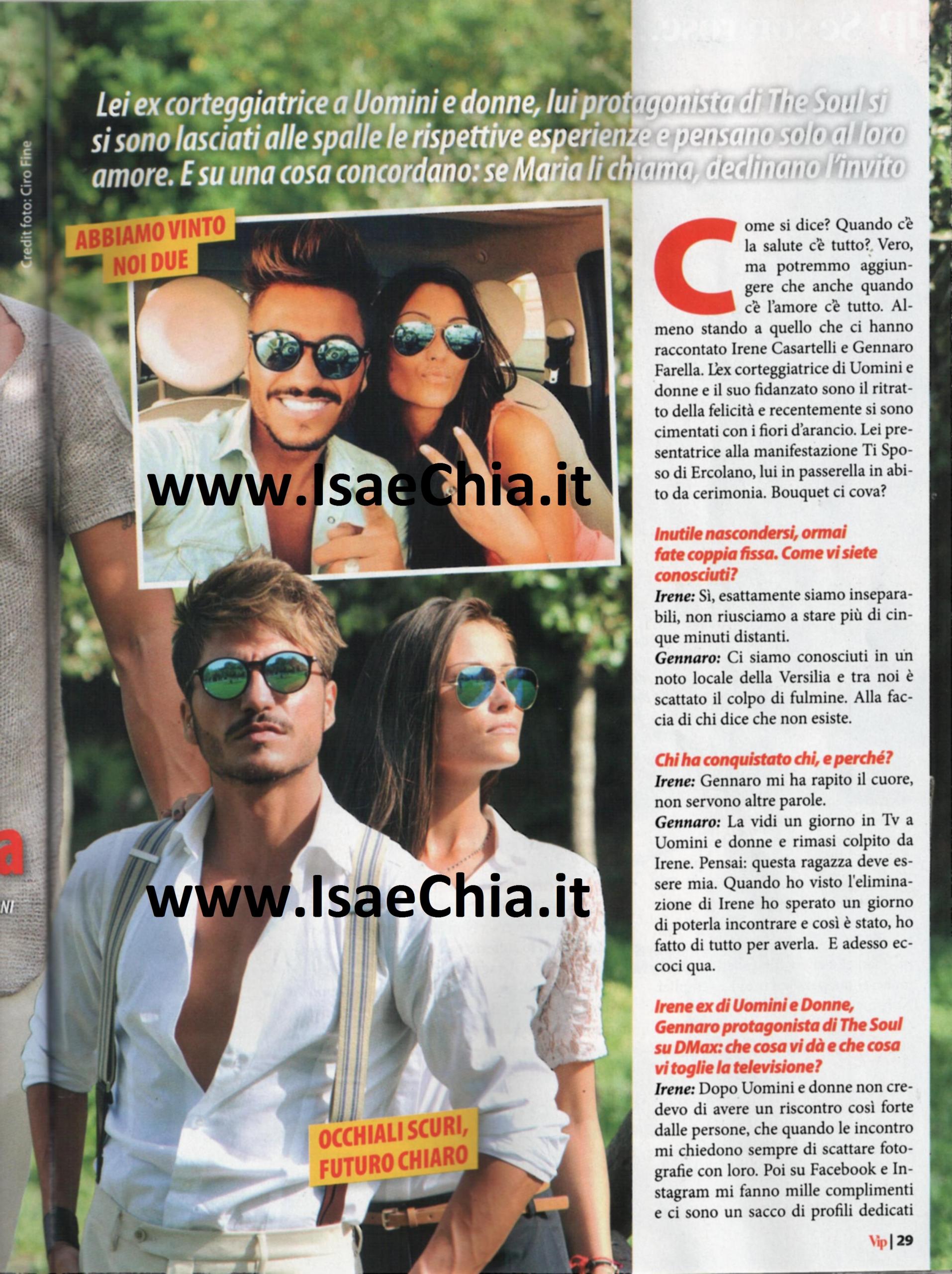 Ospiti d’onore all’evento Ti sposo di Ercolano, l’ex corteggiatrice Irene Casartelli e il suo fidanzato Gennaro Farella hanno fatto le prove generali con i fiori d’arancio. In effetti, la loro storia si fa sempre più seria: “Ci siamo conosciuti in un locale della Versilia ed è stato colpo di fulmine. Da allora non ci siamo più separati. Io l’avevo vista in tv e mi aveva colpito. Mi sono detto: “Questa ragazza deve essere mia” e quando ho visto la sua eliminazione, ho sperato di incontrarla, un giorno” dice lui, che è stato in tv nel programma The Soul su D-Max. “Dopo Uomini e donne non credevo di aver avuto un riscontro così forte: le persone mi chiedono di fare le foto con loro, su Facebook e Instagram mi fanno un sacco i complimenti e ci sono un sacco i profili dedicati a noi. Direi che la tv mi ha più dato che tolto” dichiara la bella toscana. “Non mancano le critiche, ma noi ci ridiamo sopra e lasciamo perdere” dice invece il fidanzato. Parlando dell’evento Ti sposo, raccontano: “Speriamo di rimanere nel mondo dello spettacolo, ma il nostro sogno è aprire insieme in negozio d’abbigliamento. All’evento ho avuto la possibilità di presentare per la prima volta le varie sfilate dei migliori atelier presenti. Ma per indossare gli abiti del nostro matrimonio…Vediamo, tempo al tempo! Se ci offrissero di andare a Uomini e donne? Assolutamente no! Che senso avrebbe? E’ un programma per single, non per le coppie felici come noi”.