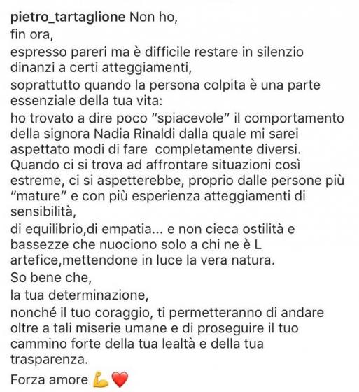 Una dichiarazione che ha lasciato interdetti i telespettatori, tra cui anche l’ex corteggiatore di Uomini e Donne e attuale fidanzato di Rosa, Pietro Tartaglione. L’avvocato campano ha giudicato spiacevole il comportamento dell’attrice, dalla quale – a parer suo – si sarebbe aspettato certamente un atteggiamento diverso e sicuramente più maturo. Infine, Tartaglione elogia la determinazione e il coraggio della sua compagna e la esorta a proseguire il cammino con trasparenza e lealtà: