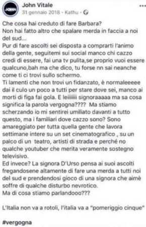 Nei giorni scorsi infatti la giornalista Selvaggia Lucarelli aveva scovato e diffuso in rete un post contro Barbara D’Urso e i suoi programmi televisivi che il 33enne di Napoli aveva scritto l’anno scorso su Facebook: