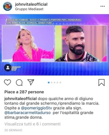 Le frasi altamente sessiste ed offensive utilizzate da Vitale verso la conduttrice partenopea sono peraltro risultate molto in contrasto con le belle parole spese invece dall’aspirante naufrago per Barbara dopo la sua partecipazione a Pomeriggio 5 proprio poco prima di approdare in Honduras: