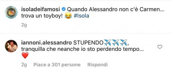 La Di Pietro ha osservato che si può permettere di avere questo atteggiamento verso Luca solo perché il figlio Alessandro Iannoni non è più sull’isola. “Lui mi ha mandato quel video osceno, allora io e te ci infrattiamo là dentro. Alessà, ciao!“, ha detto la naufraga riferendosi allo scherzo messo in atto da Alessandro nel corso dell’ultima puntata del reality. Il ragazzo aveva fatto credere alla madre di essere molto impegnato in serate tra amici e circondato da ragazze interessate a lui.