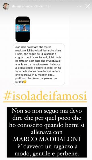Ciao Deia, ho notato che Marco Maddaloni, il fratello di Laura che vinse l’Isola, non segue su Ig la sorella e il cognato. Inoltre a inizio Isola ha fatto un post sulla sua avventura di anni fa senza menzionare un in bocca al lupo alla sorella e al cognato, e poi ieri ha fatto delle stories dove faceva vedere che guardava made in sud, piuttosto che L’Isola. Mi pare un po strano.
