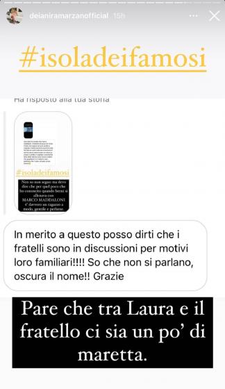 Ciao Deia, ho notato che Marco Maddaloni, il fratello di Laura che vinse l’Isola, non segue su Ig la sorella e il cognato. Inoltre a inizio Isola ha fatto un post sulla sua avventura di anni fa senza menzionare un in bocca al lupo alla sorella e al cognato, e poi ieri ha fatto delle stories dove faceva vedere che guardava made in sud, piuttosto che L’Isola. Mi pare un po strano.