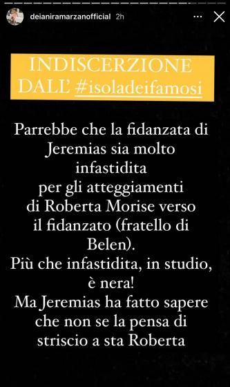 Roberta Morise interessata a Jeremias Rodriguez? A insinuare il dubbio qualche giorno fa era stata Lory Del Santo. La showgirl in coppia sull’isola con il fidanzato Marco Coculo si era confrontata con il fratello di Belen affermando di aver visto la conduttrice di origini calabresi molto vicina al naufrago, chiedendogli cosa secondo lui avrebbe pensato la fidanzata a riguardo. Jeremias aveva subito messo a tacere il rumor, affermando di non aver notato nulla di sbagliato da parte della Morise. Aggiungendo inoltre che qualora avesse notato un atteggiamento diverso da parte della donna, sarebbe stato il primo a prendere le distanze.