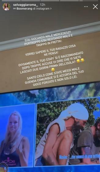 Intanto anche un’ex gieffina ha voluto esprimere il suo pensiero in merito al comportamento di Mercedesz Henger attraverso il suo profilo Instagram. Stiamo parlando di Selvaggia Roma, ex concorrente di Temptation Island e del Grande Fratello. Secondo Selvaggia la naufraga starebbe giocando e anche male: