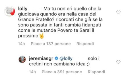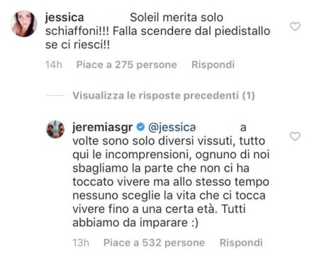 Ma si sa il loro avvicinamento non ha convinto del tutto il pubblico a casa, e sotto a questo post non sono mancate le critiche soprattutto all’indirizzo della Sorge. A balzare all’occhio di Jeremias però è stato soprattutto il commento di un’utente che – con toni tutt’altro che pacati – ha invitato l’argentino a far scendere la sua dolce metà dal piedistallo. L’ex naufrago a quel punto si è sentito di prendere le difese di Soleil ed ha replicato: