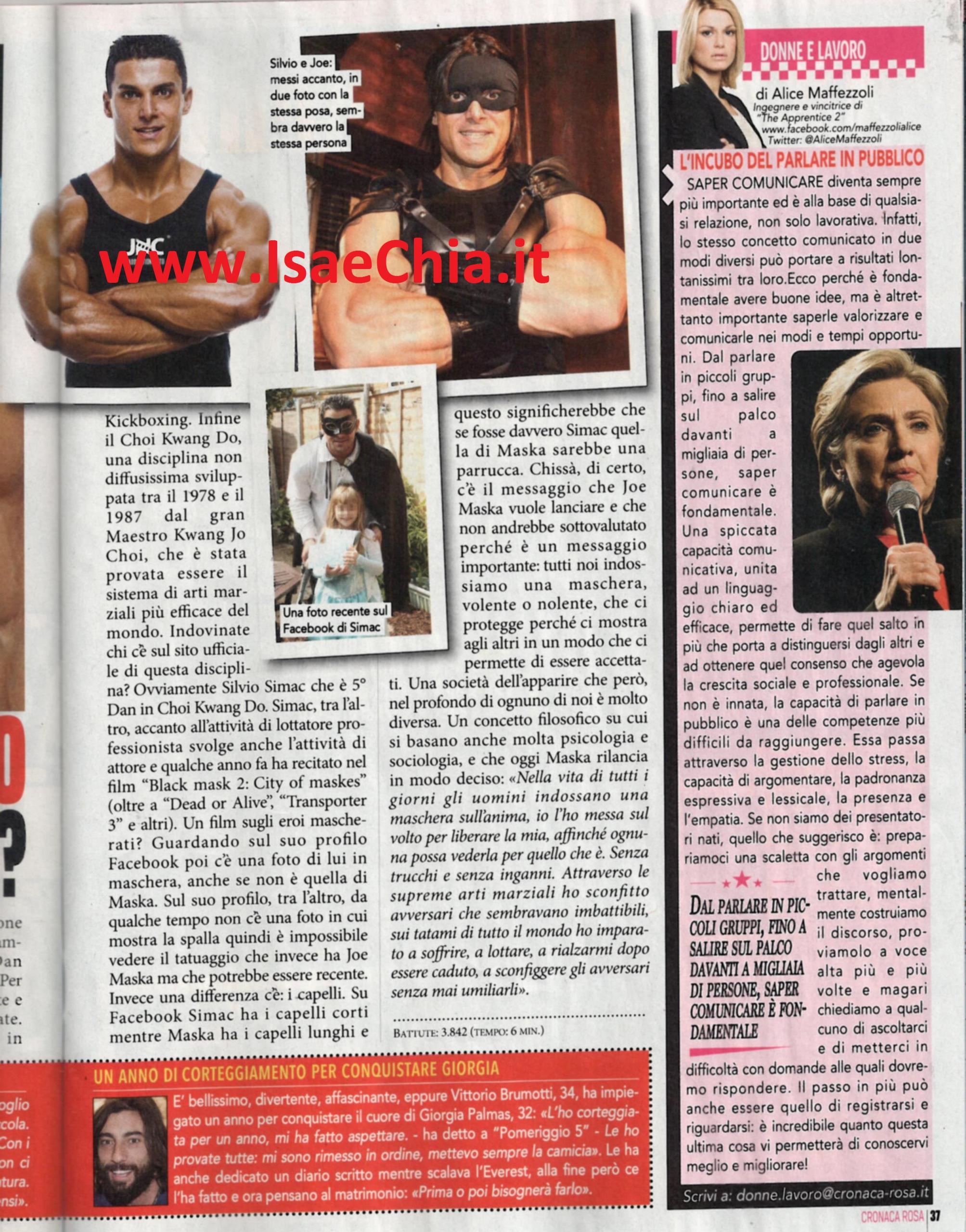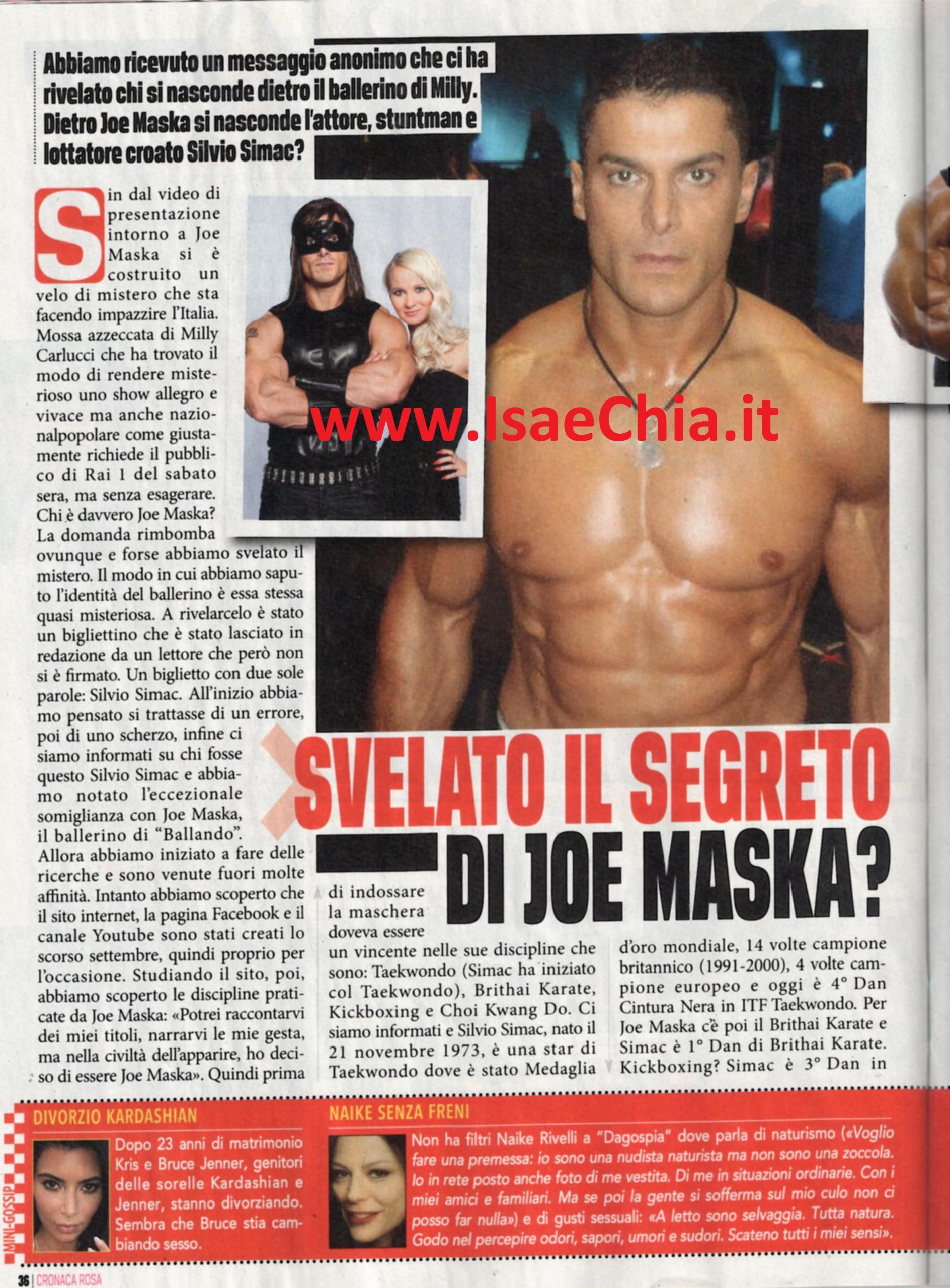 Il misterioso personaggio di Ballando con le stelle, Joe Maska, ha lasciato il programma in seguito al verdetto del pubblico, ma non ha svelato la sua identità come aveva promesso. Chi è dunque Joe Maska? Per ora l’unica cosa certa è che quella di Milly Carlucci è stata una mossa molto astuta, che ha tenuto il pubblico sulle spine. La rivista Cronaca rosa, però, ha ricevuto un grande indizio, un bigliettino anonimo con su scritto Silvio Simac. Cercando questo nome in Rete, è impossibile non notare la grande somiglianza con il ballerino del programma. Il suo sito e la sua pagina Facebook sono stati creati a settembre, proprio in coincidenza con l’inizio dello show di Raiuno. Coincidenza? E poi, le poche dichiarazioni dell’uomo mascherato: “Potrei raccontarvi dei miei titoli, narrarvi le mie gesta, ma nella civiltà dell’apparire, ho deciso di essere Joe Maska”. Quindi, prima di fare il ballerino, doveva essere un gran campione. E Silvio Simac, nato nel 1973, lo è: campione britannico 14 volte di Taekwondo prima, poi Brithai karate, kickboxing e choi kwang do, il sistema di arti marziali più forte del mondo. Ma non solo! Silvio ha recitato anche in alcuni film, tra cui Black Mask 2: City of Masks, un film sugli eroi mascherati. E sul suo profilo c’è una foto con una maschera, seppur diversa da quella che indossa ora. Una differenza tra i due, però, c’è: su Facebook Simac ha i capelli corti, mentre il personaggio di Ballando ha i capelli lunghi. Che sia una parrucca? Chissà. Ciò che è certo, è che Joe Maska ha voluto lanciare un messaggio: “Nella vita di tutti i giorni indossiamo una maschera sull’anima; io l’ho messa sul volto per liberare la mia, affinché tutti potessero vedere com’è. Attraverso le arti marziali ho sconfitto avversari che sembravano imbattibili; ho imparato a soffrire, a rialzarmi dopo esser caduto, a sconfiggere gli avversari senza mai umiliarli”.