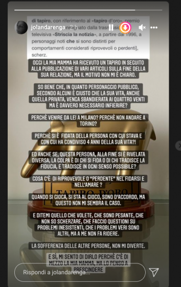 Ad intervenire sulla questione è stata Jolanda, primogenita di Ambra Angiolini e frutto dell’amore passato con Francesco Renga. Attraverso il suo profilo Instagram, la 17enne non le ha mandate a dire e ha fatto sapere il suo punto di vista sulla vicenda mediatica che si è creata intorno alla relazione della sua mamma e il mister Allegri.