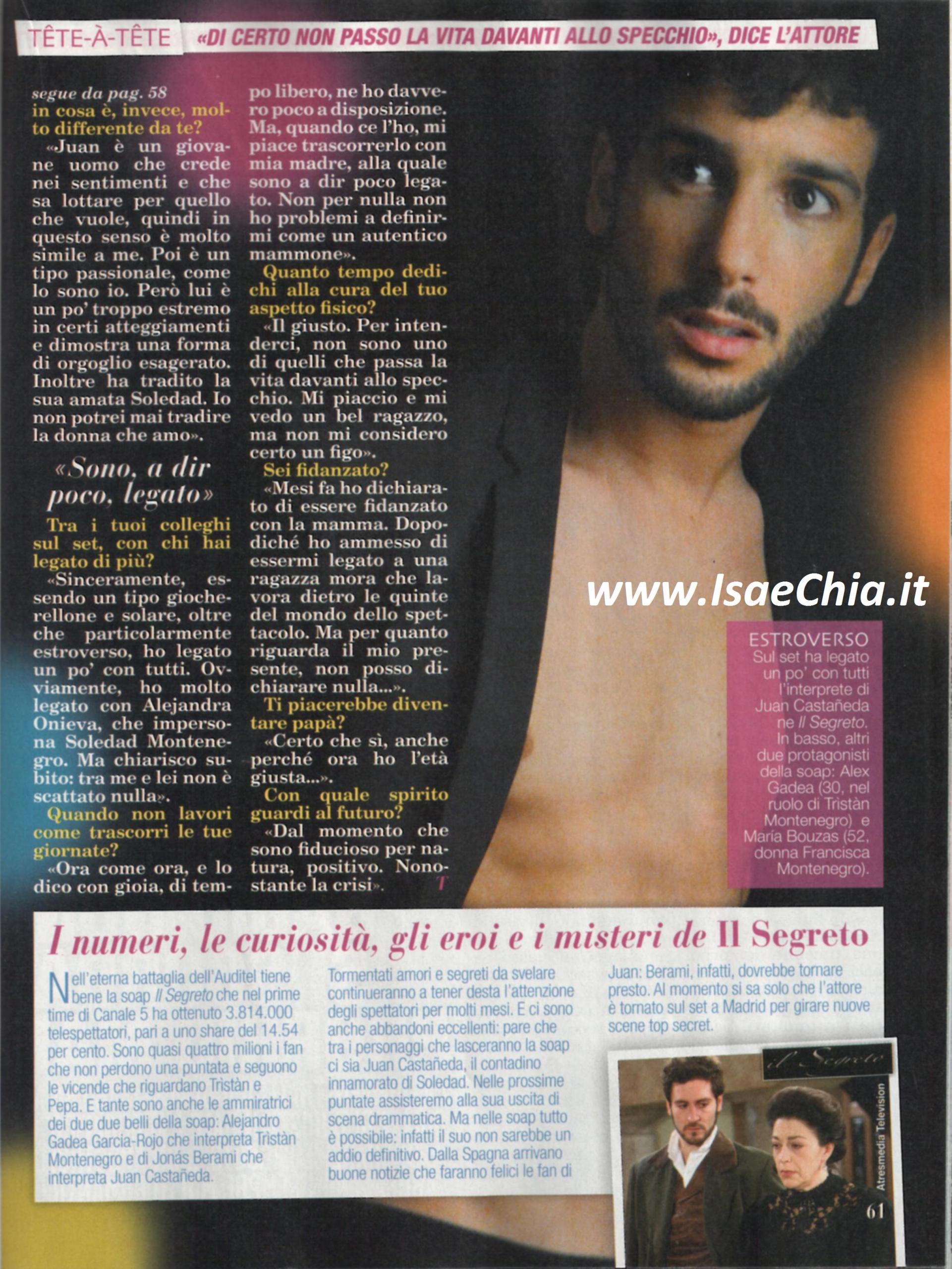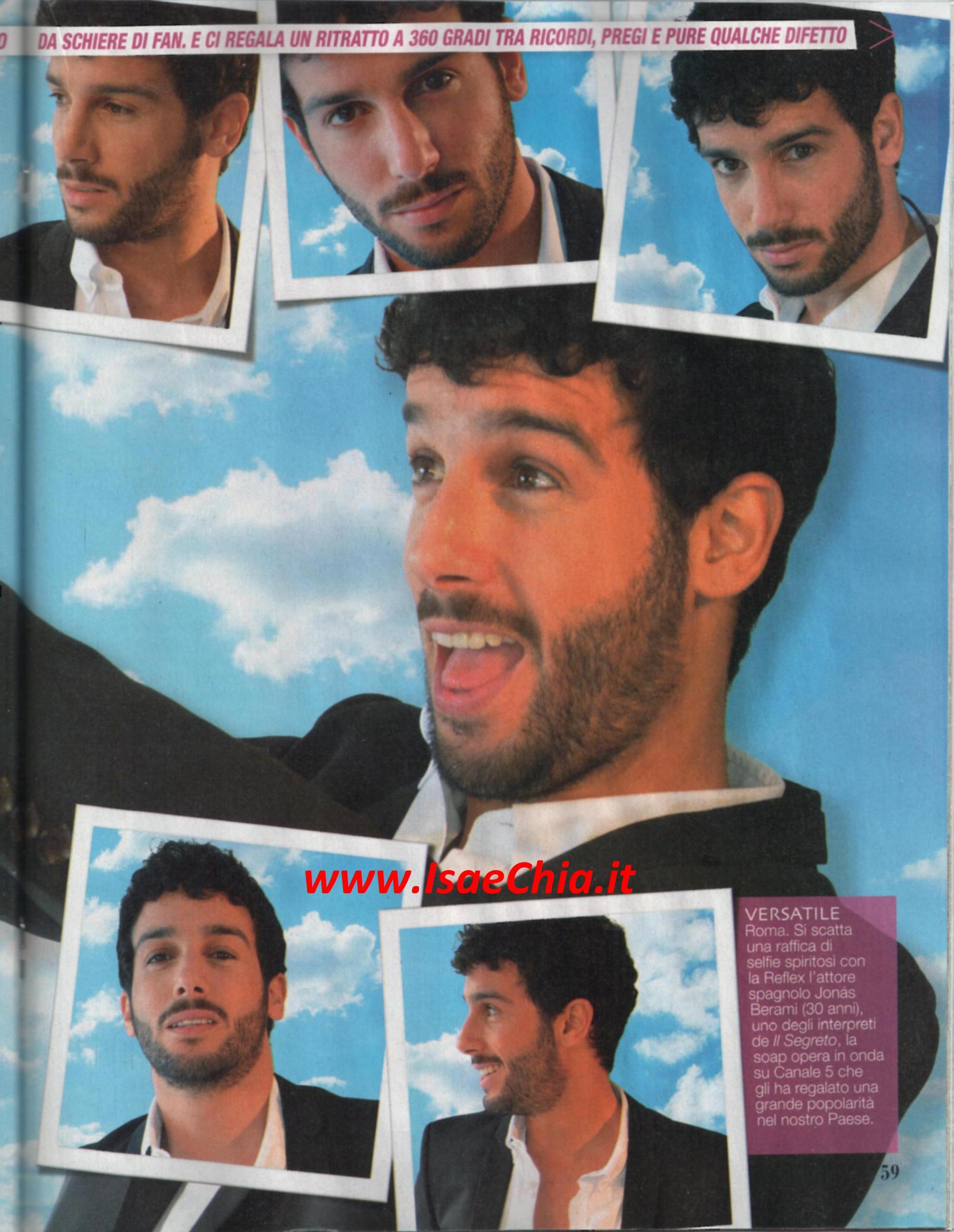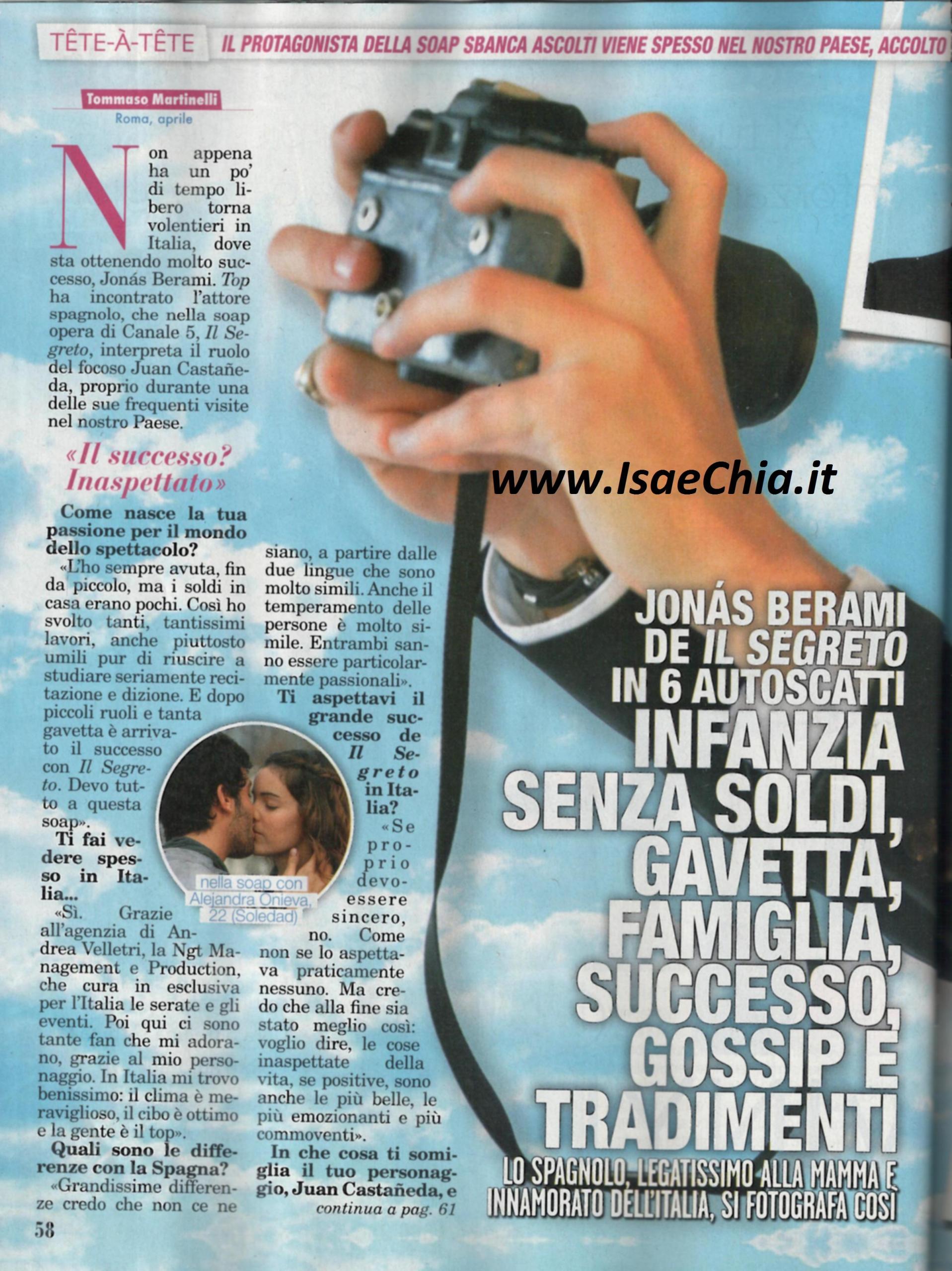 Grazie all’incredibile successo della telenovela Il Segreto, Jonas Berami, che interpreta Juan Castaneda, è diventato molto popolare in Italia. “Ho sempre avuto la passione per lo spettacolo, ma i soldi in casa erano pochi, così ho svolto tantissimi lavori, anche umili per poter studiare recitazione e dizione. E dopo tanti piccoli ruoli è arrivato Il segreto. Sono spesso in Italia grazie ad un’agenzia italiana che si occupa delle mie serate qui. Qui ci sono tante fan che adorano il mio personaggio, il clima è bellissimo e il cibo è il top. Non c’è molta differenza con la Spagna, compresa la lingua, che è simile, e il temperamento delle persone. Sinceramente, non mi aspettavo il successo di Il segreto in Italia, come non se lo aspettava nessuno. Juan è un giovane uomo passionale, che lotta per ciò che vuole e in questo è molto simile a me, ma è estremo in alcuni atteggiamenti ed esagerato. E io non potrei mai tradire la donna che amo, come ha fatto lui con Soledad. Con l’attrice che la interpreta, Alejandra Onieva, ho legato molto, ma sono un tipo estroverso, ho legato un po’ con tutti e tra noi c’è solo amicizia”. Quando gli si chiede se è fidanzato, risponde: “Avevo dichiarato che ero fidanzato con mia mamma, alla quale sono a dir poco legato. Poi che c’era una ragazza mora, che lavora dietro le quinte. Oggi non posso dichiarare niente. Mi piacerebbe diventare papà, anche perché ho l’età giusta”.