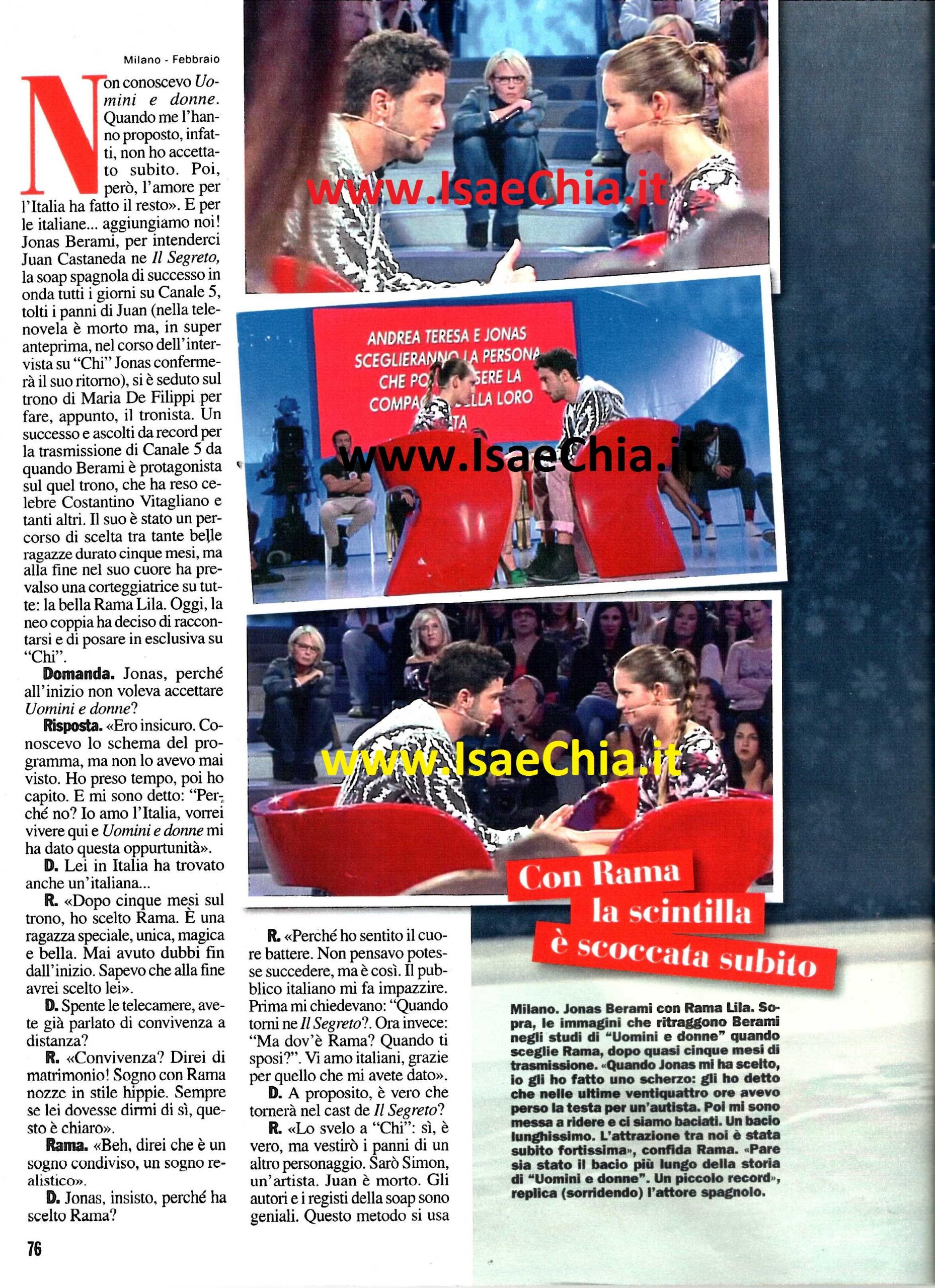 Bellissimi e innamorati, Jonás Berami e Rama Lila Giustini si sono conosciuti a settembre e sono fidanzati dal mese scorso grazie a Uomini e Donne. E dire che l’attore spagnolo inizialmente non voleva prendere parte al programma: “Non conoscevo Uomini e Donne. Quando me l’hanno proposto, non ho accettato subito. Poi, però, l’amore per l’Italia ha fatto il resto. Ero insicuro, conoscevo lo schema del programma, ma non l’avevo mai visto. Ho preso tempo, poi ho capito e mi sono detto: ‘Perché no?’. Sin dall’inizio sapevo che alla fine avrei scelto Rama Lila: è una ragazza speciale, unica, magica e bella. Ho sentito il cuore battere. Non pensavo potesse succedere, ma è così. Il pubblico italiano mi chiedeva: ‘Quando torni ne Il Segreto‘? Adesso mi chiedono: ‘Quando sposi Rama?‘” racconta lui. Così, quando gli si chiede se pensano già alla convivenza, risponde: “Convivenza? Direi matrimonio: sogno delle nozze in stile hippie, sempre che lei dovesse dirmi di sì!“. E così interviene la fidanzata: “Beh direi che è un sogno condiviso, un sogno realistico“. “Io vivo ad Ibiza perché è un’isola che ti fa sentire libero e io ho un animo molto hippie. Da grandi magari vivrò lì. Ops, vivremo lì” dice lui, e lei aggiunge: “Ah ecco, mi sentivo esclusa. Lo sa che mia madre è una hare krishna, dottrina religiosa che ha fede nella figura di Krishna, ma io mi sento molto hippie, vicina a Jonás!“. Ritornando sul discorso “Il Segreto“, chiedendogli se è vero che tornerà nella soap record di ascolti, Jonás rivela: “E’ vero, ma non nei panni di Juan Castaneda, bensì in quelli di Simon, un artista. Juan è morto, ma questo è un metodo per far tornare un personaggio molto richiesto. Sul set non è nata nessuna passione, ma una grande complicità. L’amore l’ho trovato in Italia, dove spero di affermarmi anche come attore: amo Bernando Bertolucci, Paolo Sorrentino e Roberto Benigni“. Infine, quando gli si chiede del lato “sensuale” scoperto con Rama, confessa: “Non avevo bisogno di spegnere le telecamere per capirlo: la scintilla era già accesa. Ma non mi faccia domande sul sesso, la prego. Io ho accettato Uomini e Donne davvero per trovare l’amore” e Rama conferma: “Idem per me. Lui mi è piaciuto da subito. Fisicamente e anche come testa. C’è stata quella magia o alchimia. Si percepisce anche da queste foto, no?“