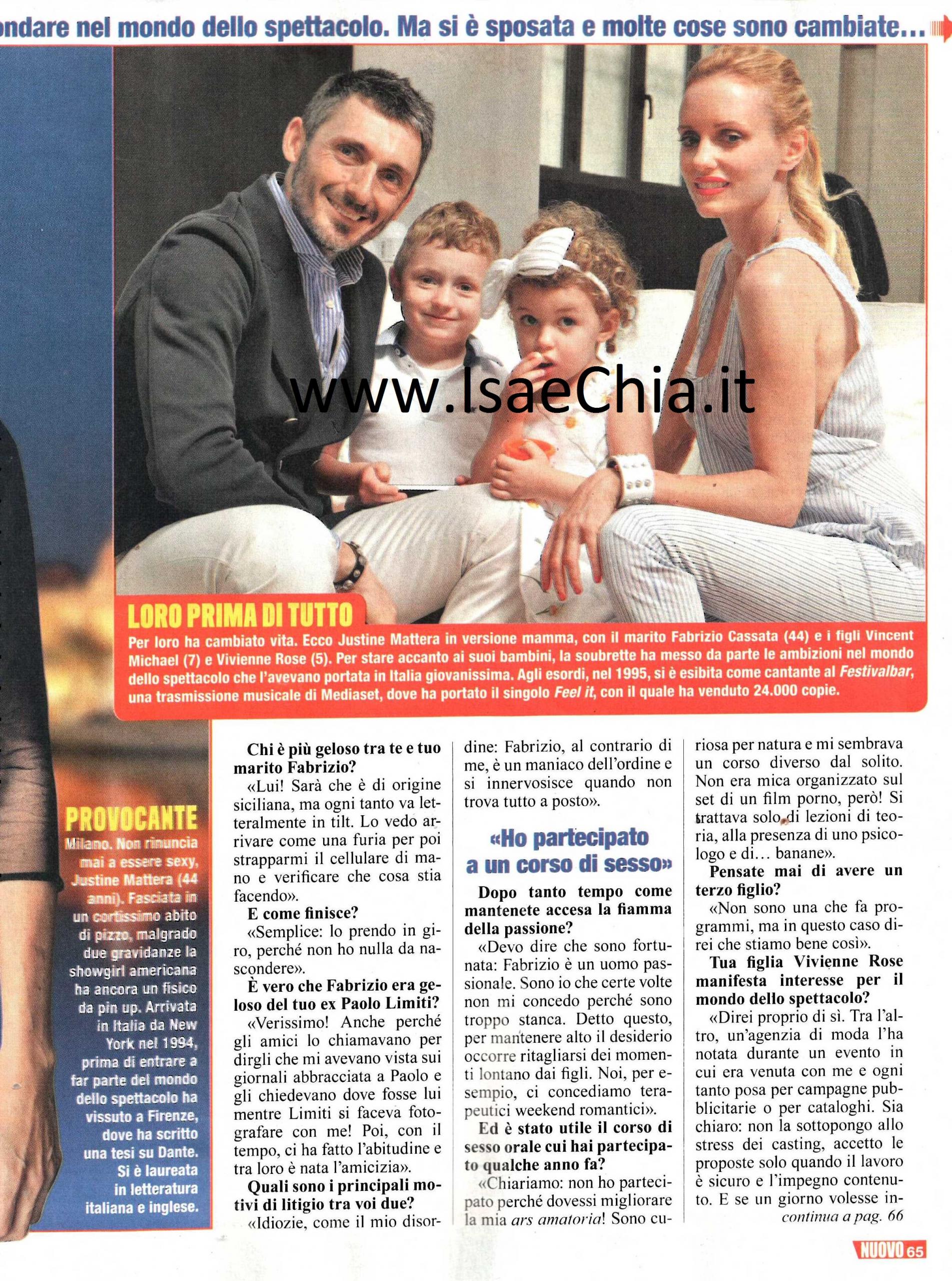 Da quando Justine Mattera sta con Fabrizio Cassata, la loro storia è stata data spesso per spacciata. E invece l’attrice newyorkese e il marito stanno per festeggiare 12 anni d’amore: “Siamo una coppia solida e complice, abbiamo due bellissimi figli e viviamo in una bellissima casa. Non potrei chiedere di più” esordisce lei. E quando le si chiede quale sia il segreto del loro amore, rivela: “La differenza di carattere: io sono un’artista distratta e creativa, lui un imprenditore razionale e preciso e di conseguenza, nella vita di tutti i giorni ci compensiamo“. Quando si chiede se anche loro hanno avuto dei momenti difficili, l’ex concorrente de La fattoria racconta: “E chi non ne ha? Io e Fabrizio abbiamo vissuto un momento di crisi profonda quando, entrata nella compagnia del Bagaglino, ci siamo trasferiti a Roma nel 2008. Fu un periodo tosto: tra noi regnavano tensione, nervosismo, insoddisfazione e la nostra relazione si sgretolava giorno dopo giorno davanti ai nostri occhi. La svolta è avvenuta con il secondo figlio: quando ho smesso di mettermi davanti a tutto e a tutti e mi sono resa conto che, nonostante amassi il mio lavoro, la cosa a cui tenevo di più fosse la mia famiglia. Così abbiamo lasciato a Roma e siamo tornati a Milano. Da allora la carriera è passata in secondo piano rispetto ai miei figli. Per stare vicino ai miei figli ho rifiutato vari progetti. Avrei potuto arricchire curriculum e portafogli, ma non ho rimpianti: tutto sommato preferisco essere una mamma presente. Certo, quando un lavoro è davvero eccezionale non rinuncio, ad esempio, al musical A qualcuno piace caldo, con cui ho girato l’Italia nel 2013, un’occasione davvero imperdibile”. Quando le si chiede chi è più geloso tra i due, Justine risponde: “Lui! Sarà l’origine siciliana, ma a volte va in tilt, lo vedo arrivare come una furia e strapparmi il cellulare da mano. Ma finisce che lo prendo in giro, perché non ho nulla da nascondere! Era geloso del mio ex Paolo Limiti: gli amici lo chiamavano per dirgli che mi avevano vista sui giornali con lui e gli chiedevano dove fosse mentre Limiti si faceva fotografare con me! Poi, però, ci ha fatto l’abitudine e tra loro è nata un’amicizia“. Quando si chiede, invece, come mantengono accesa la fiamma, rivela: “Devo dire che sono fortunata: Fabrizio è un uomo passionale. Sono io che certe volte non mi concedo perché sono troppo stanca! Detto questo, a volte bisogna ritagliarsi dei momenti lontani dai figli e noi, per esempio, ci regaliamo dei terapeutici weekend romantici!“. A questo punto, il giornalista chiede se è stato utile il corso di sesso orale a cui la Mattera ha dichiarato di aver partecipato qualche anno fa: “Chiariamo: non ho partecipato perché dovessi migliorare la mia ars amatoria! Sono curiosa per natura e mi sembrava un corso diverso dal solito. Non era mica organizzato sul set di un film porno, però! Si trattava solo di lezioni di teoria, alla presenza di uno psicologo e di…banane!“. Quando le si chiede se progettano un terzo figlio, risponde: “Non sono una che fa programmi, ma in questo caso dico che stiamo bene così. Mia figlia Vivienne Rose è stata notata da un’agenzia e di moda e ogni tanto posa per cataloghi pubblicitari e campagne, ma accetto solo se so che il lavoro è sicuro e lo stress è contenuto“. Infine, quando le si chiede se la rivedremo presto in tv, spiega: “Non lo so. Da anni la crisi ha eroso i budget delle produzioni televisive e gli spazi si sono ridotti drasticamente. Se mi arrivasse una bella proposta, accetterei, ma mi sento realizzata anche così. Da quest’anno insegno inglese nelle scuole dei miei figli e l’anno prossimo dovrei interpretare a teatro la commedia Montagne russe, la storia di un 50enne che rimorchia una giovane donna e approfittandone dell’assenza della moglie, la invita a casa“.