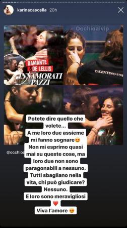 Karina non le ha certo mandate a dire ai due ex gieffini, mentre sembra molto felice del ritorno di fiamma tra Andrea Damante e Giulia De Lellis: “Potete dire quello che volete. A me loro due insieme fanno sognare. Non mi esprimo quasi mai su queste cose, ma loro due non sono paragonabili a nessuno. Tutti sbagliano nella vita, chi può giudicare? Nessuno. E loro sono meravigliosi. Viva l’amore!”.